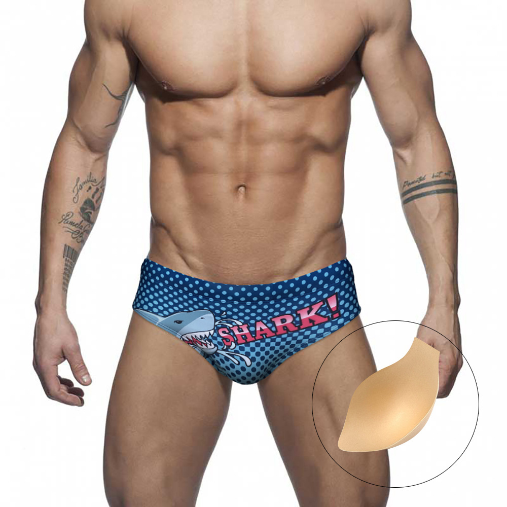 JESSBORN 남성용 수영 트렁크 컵 삼각형 낮은 허리 섹시한 수영 트렁크 상어 스포츠 속건 트렌디 한 수영복