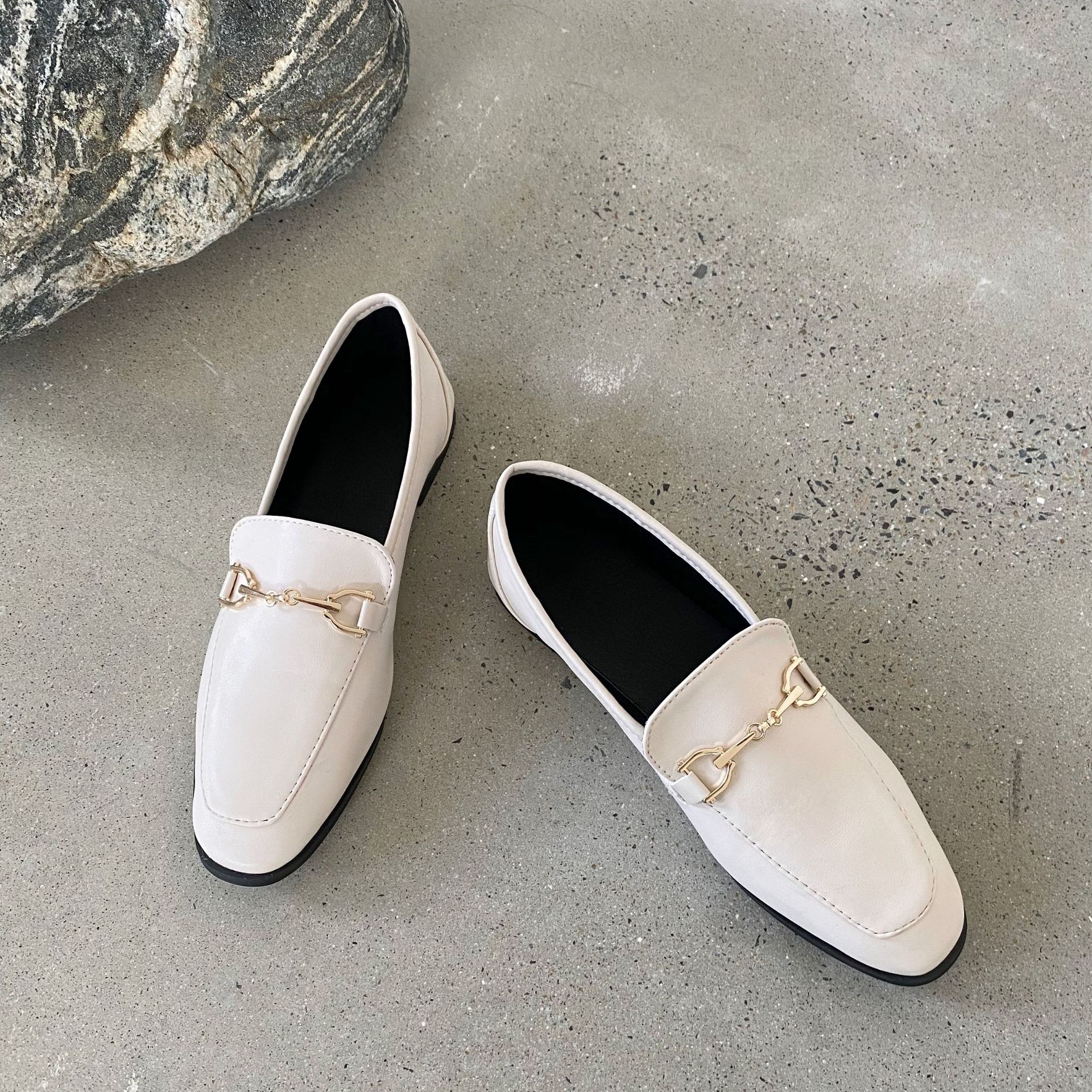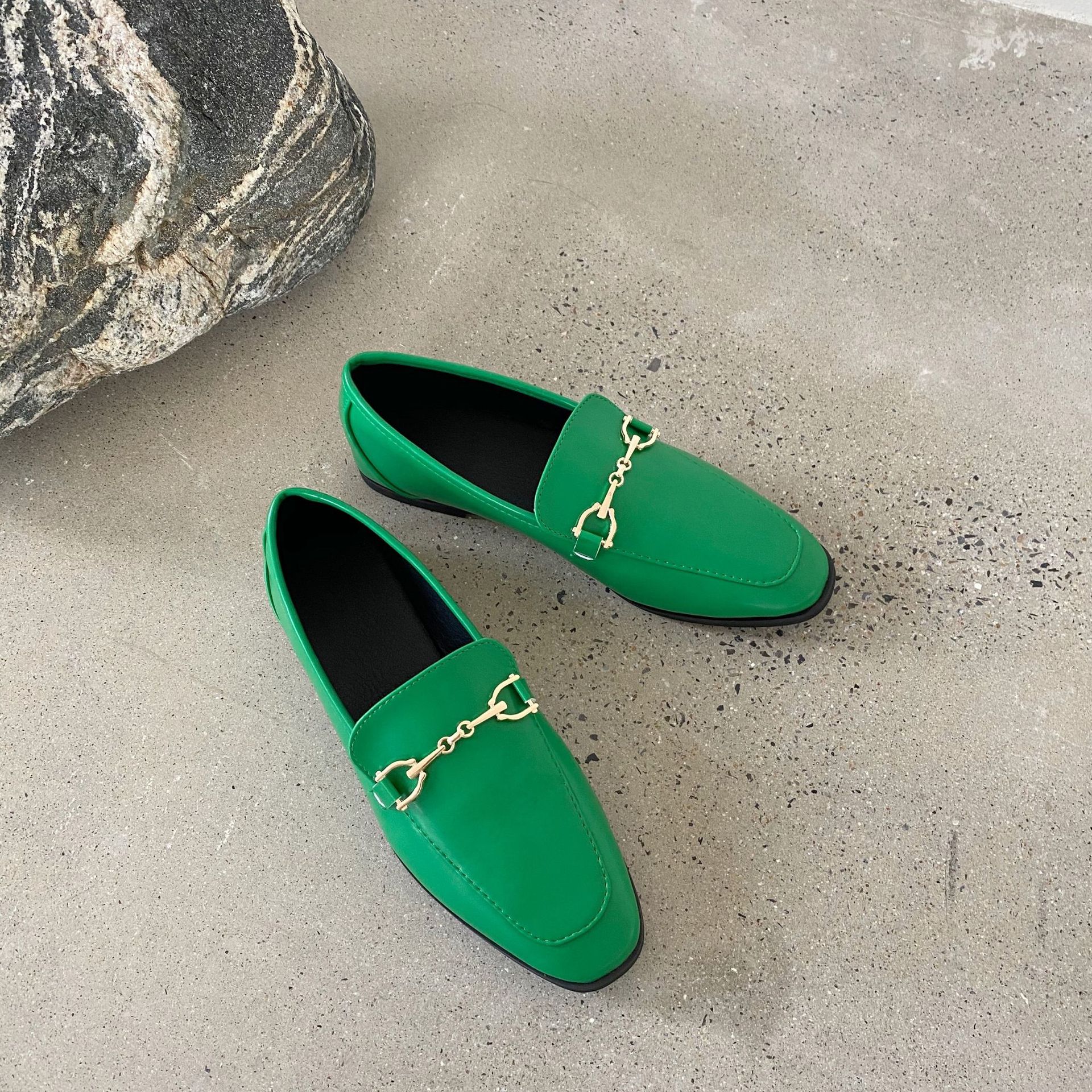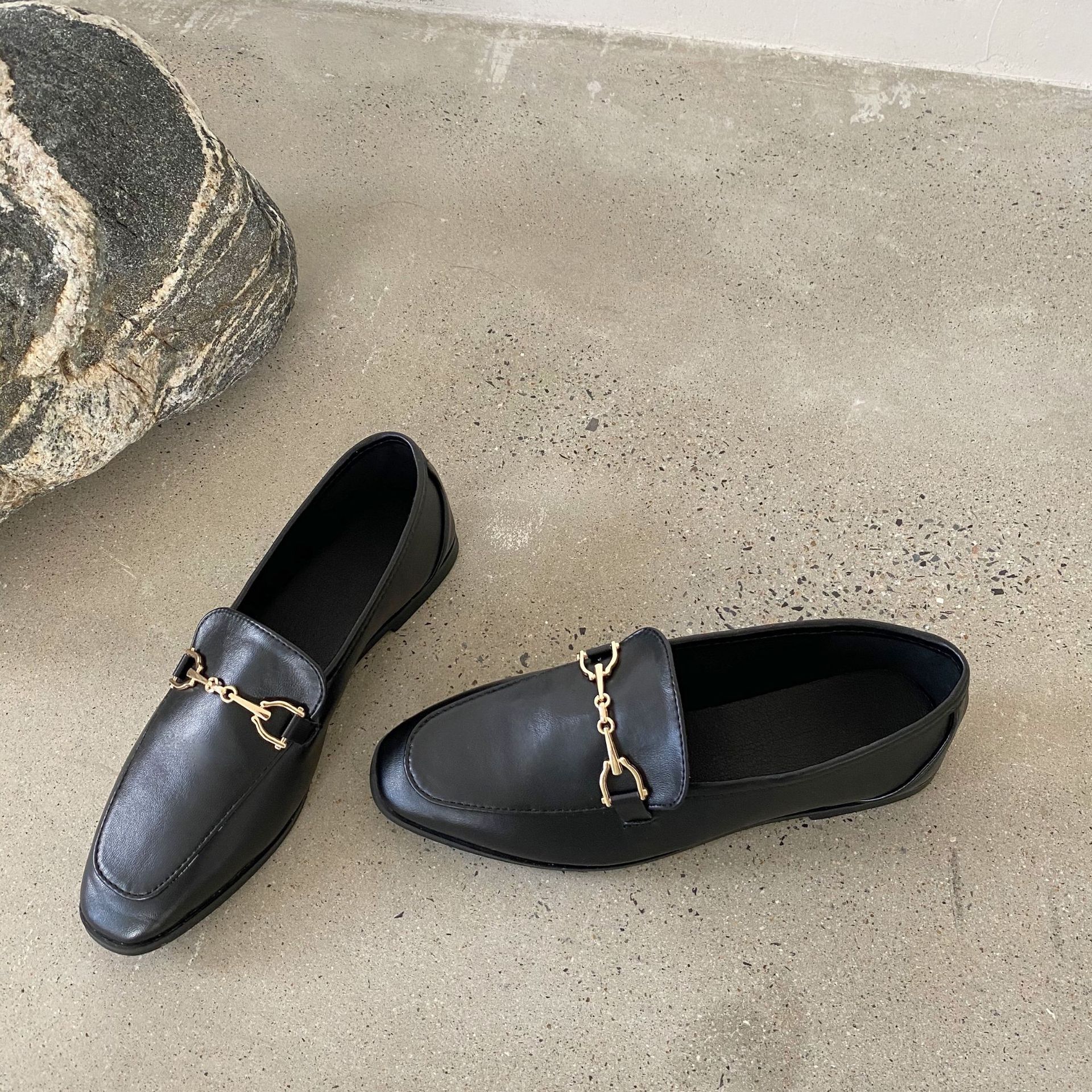 봄/여름 2023 새로운 단층 신발 여성 신발 영국 스타일 로퍼 금속 버클이있는 플랫 가죽 신발스토어 가기