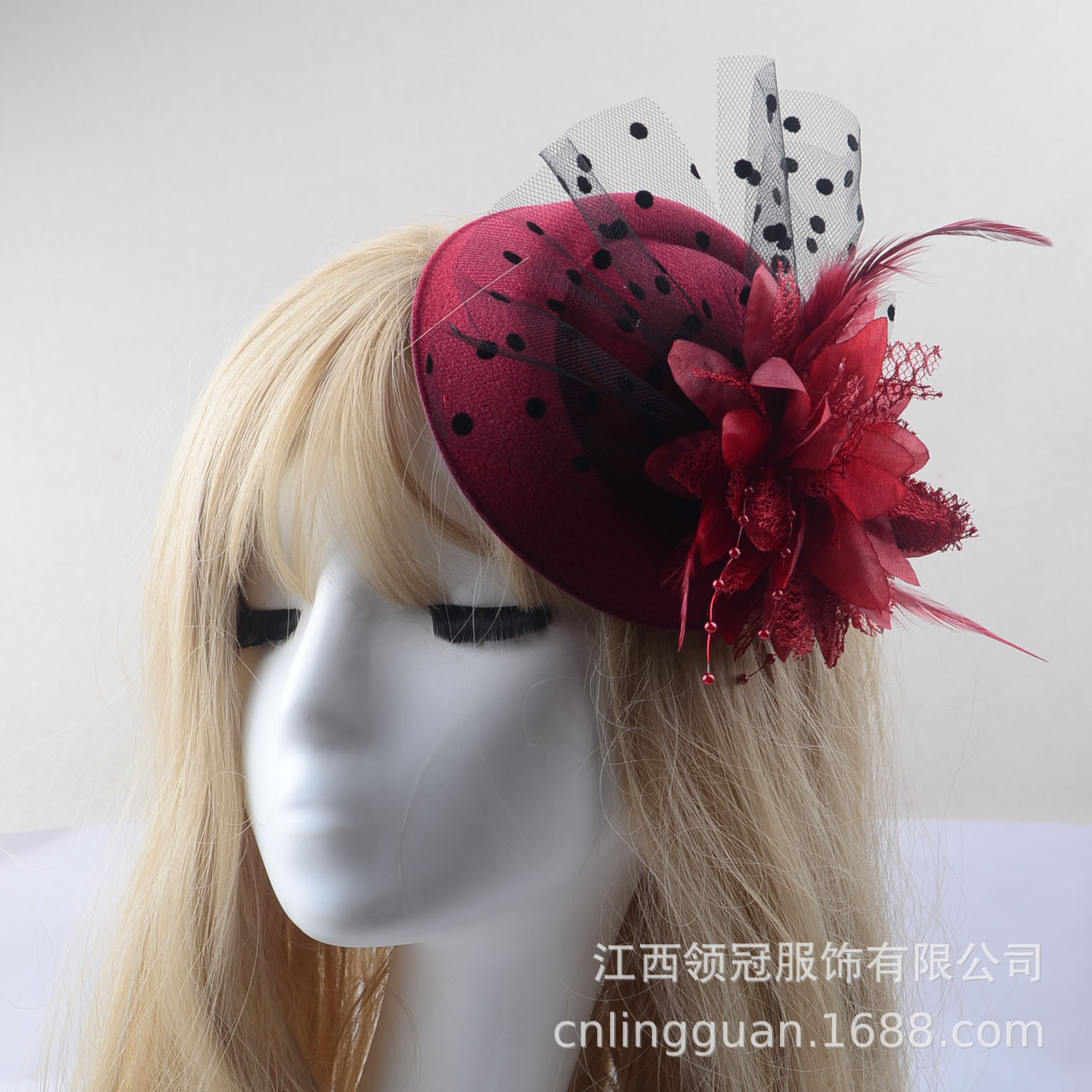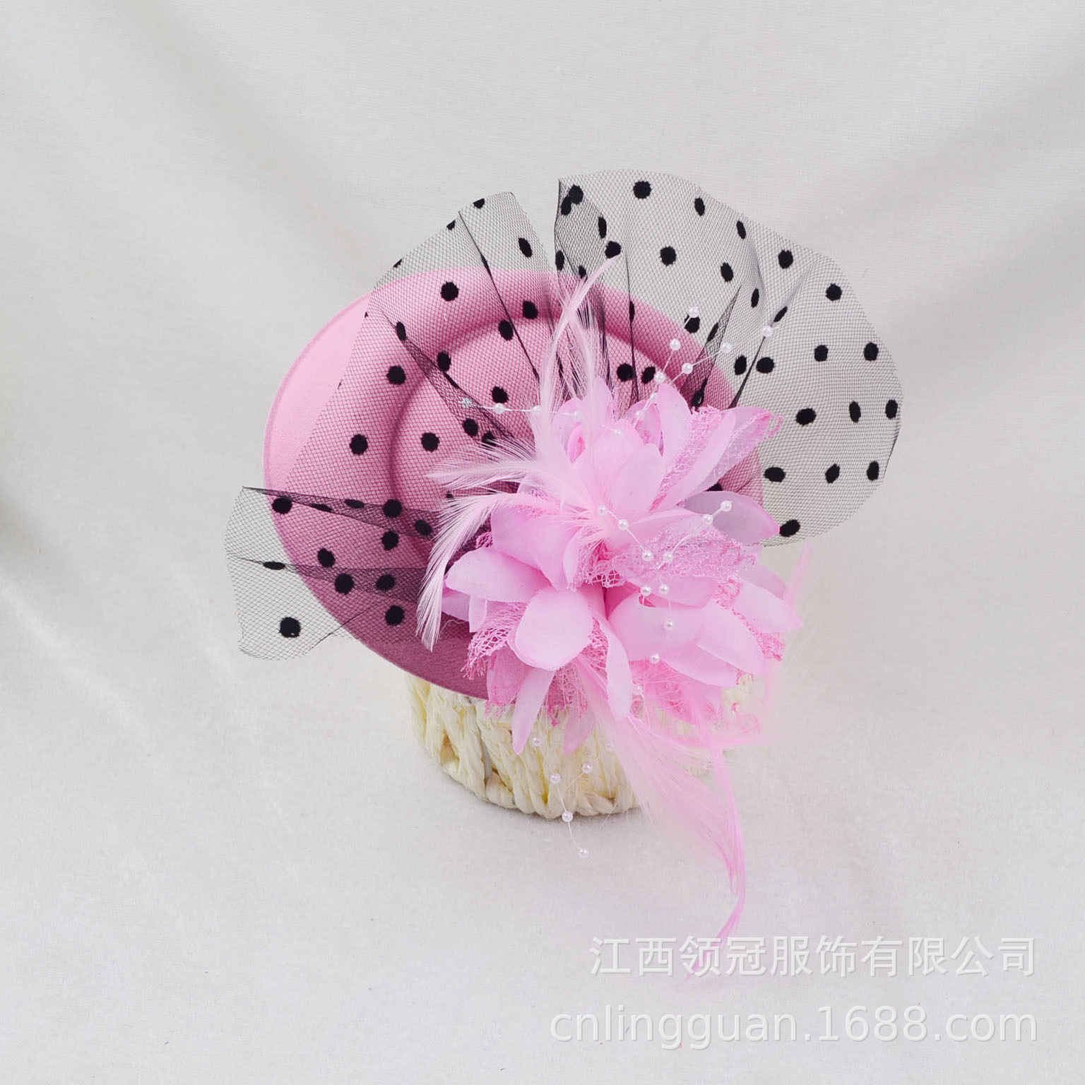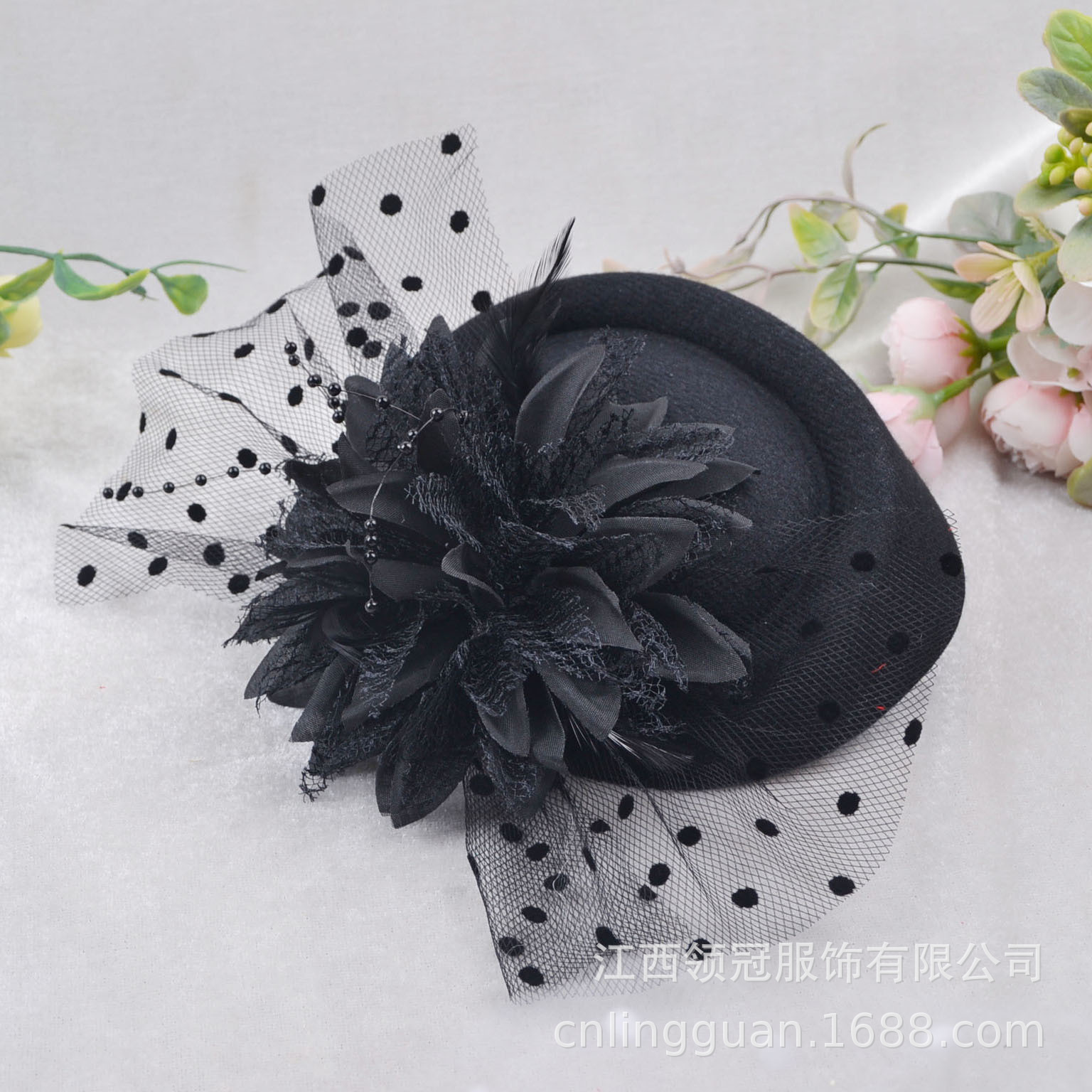 빈티지 인조 울 토퍼 모자 진주 깃털 꽃 머리핀 블랙 도트 대형 메쉬 모자 작은 모자 머리핀