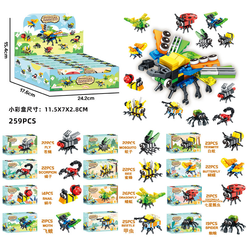 昆虫、海洋、生肖、动物(数量拍12发1套):单价为1小盒的单价,数量拍12发一大盒内12小盒。可单拼,可合体。散拍款式随机,无展示盒(易压坏 介意勿拍)