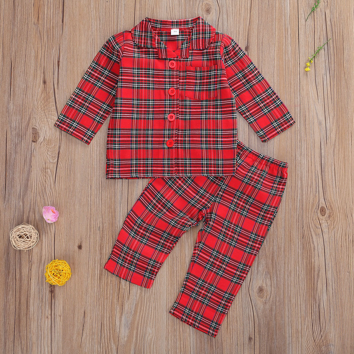 아마존 봄과 가을 어린이 잠옷 세트 소년 격자 무늬 긴팔 셔츠면 스트레이트 바지 여자 홈웨어