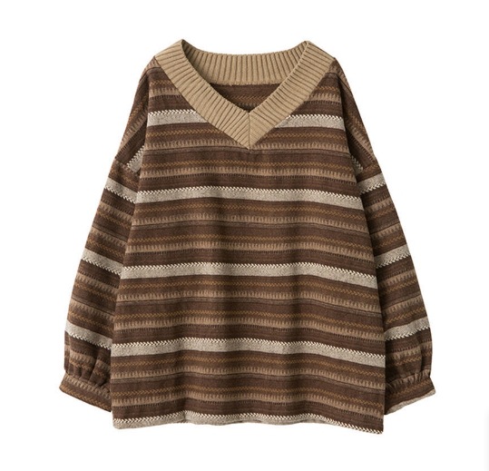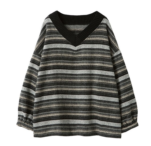 2023 여학생 한국 가을과 겨울 새로운 스트라이프 대비 컬러 V-넥 게으른 스타일 풀오버 여성용 느슨한 고급 스웨터