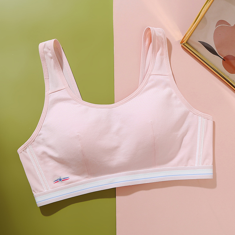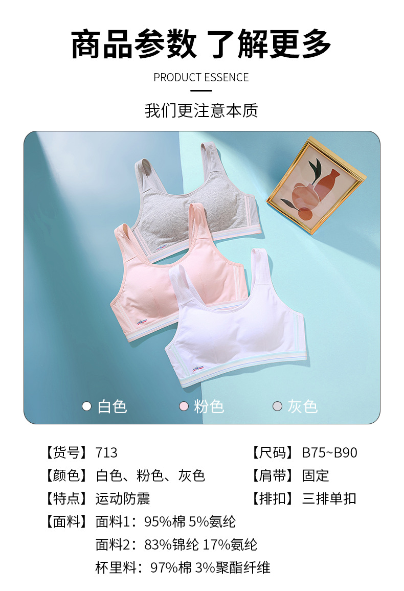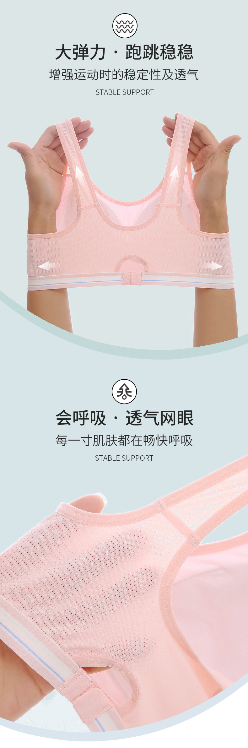此款为运动型背心,固定杯型活动时不走位,具有良好的包容性和保护性,承托力好,减少胸部的压力,无背扣设计,方便穿脱,适合于从二阶段过渡到三阶段的女生穿着,下围采用双面绒宽根,亲肤的同时回弹力好不易变形,穿着服帖舒适,胸部立体空间适合发育中的少女穿着。透气网眼面料,舒适美观。