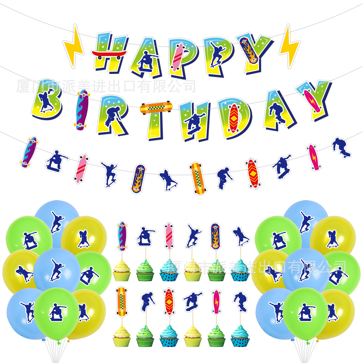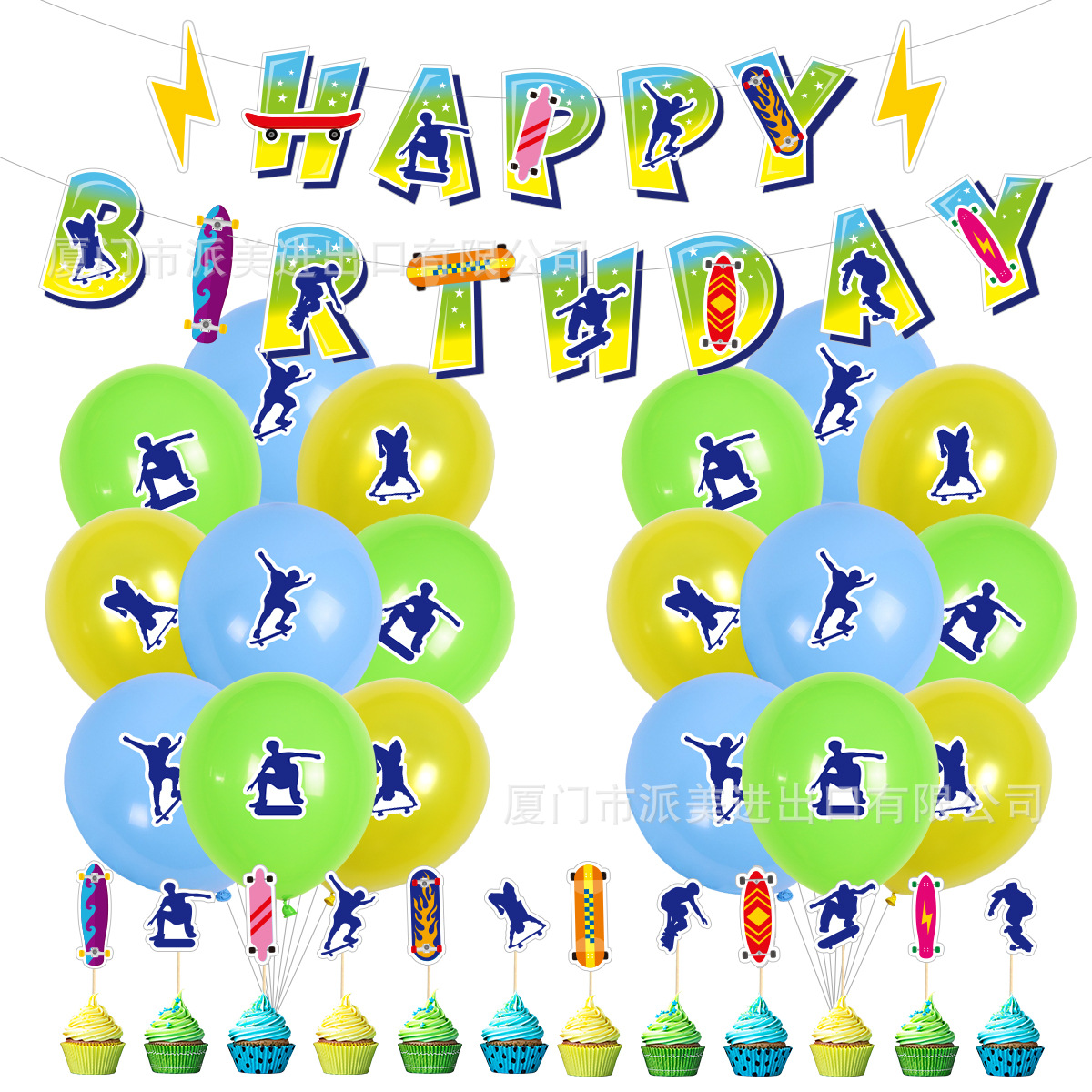 1条生日快乐拉旗+12个蛋糕插旗+1条滑板拉旗+18个12寸珠光乳胶气球