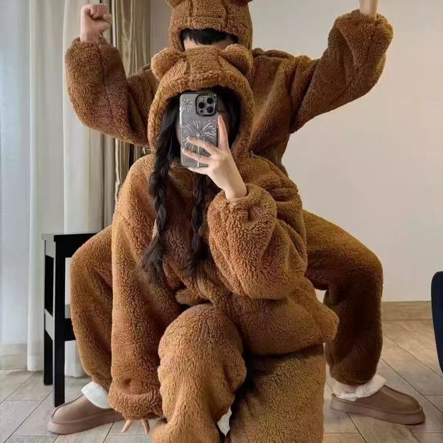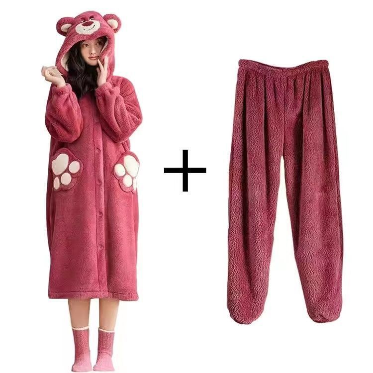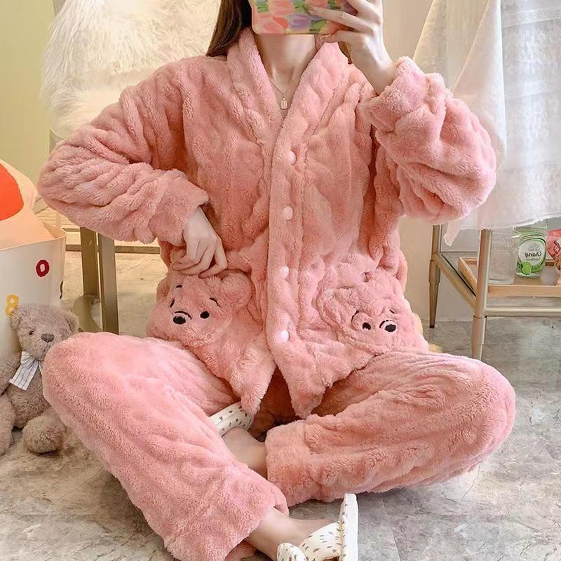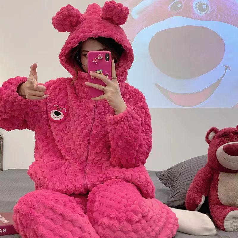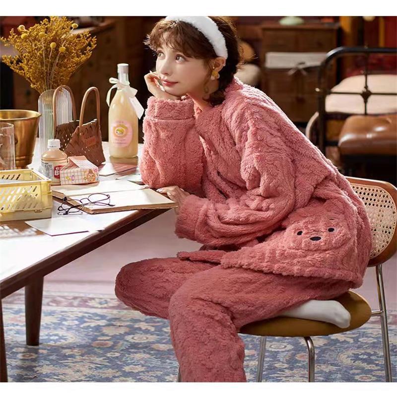 가을과 겨울 산호 양털 잠옷 여자의 겨울 두꺼운 기모 겨울 컷 꽃 곰 새로운 세트 가정 옷 플란넬스토어 가기