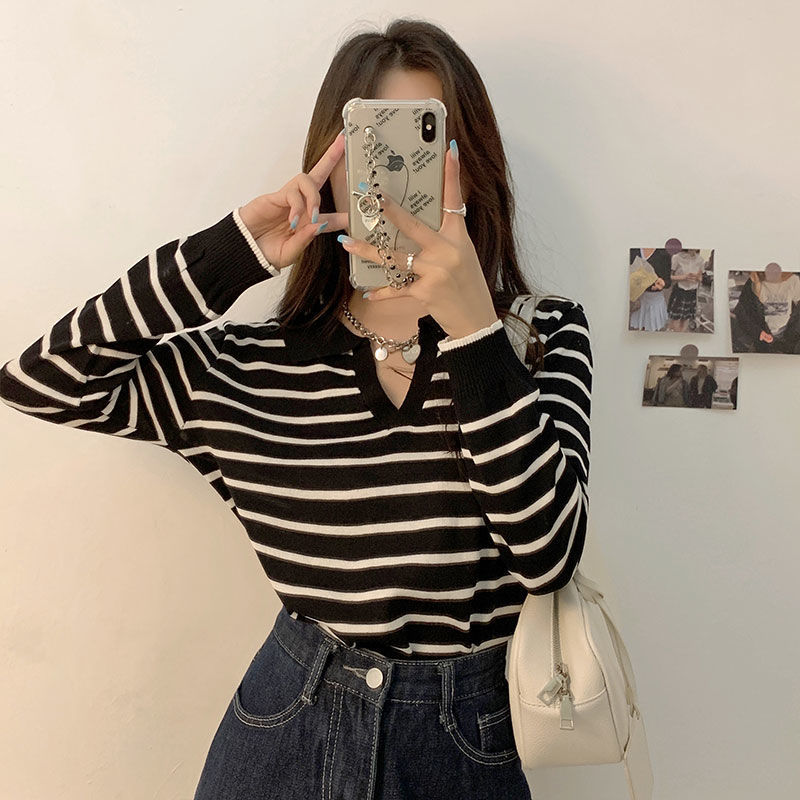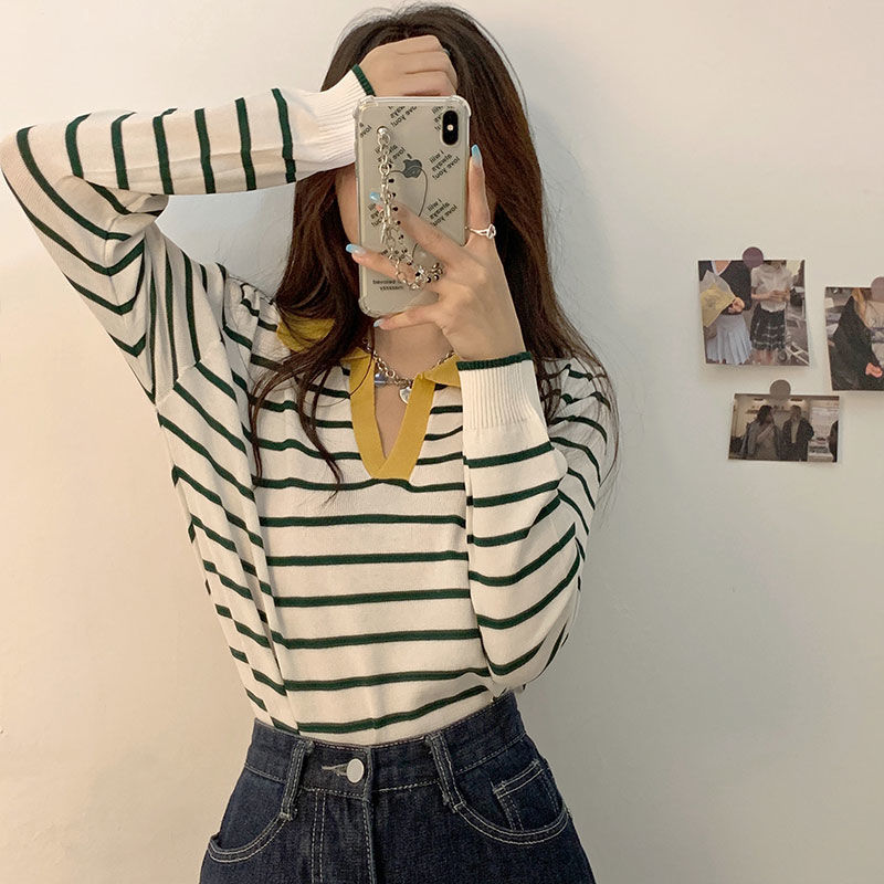 이른 봄 게으른 바람 풀오버 스트라이프 대비 폴로 칼라 슈퍼 좋은 긴 소매 니트 셔츠 탑 시크 티셔츠 여성용스토어 가기