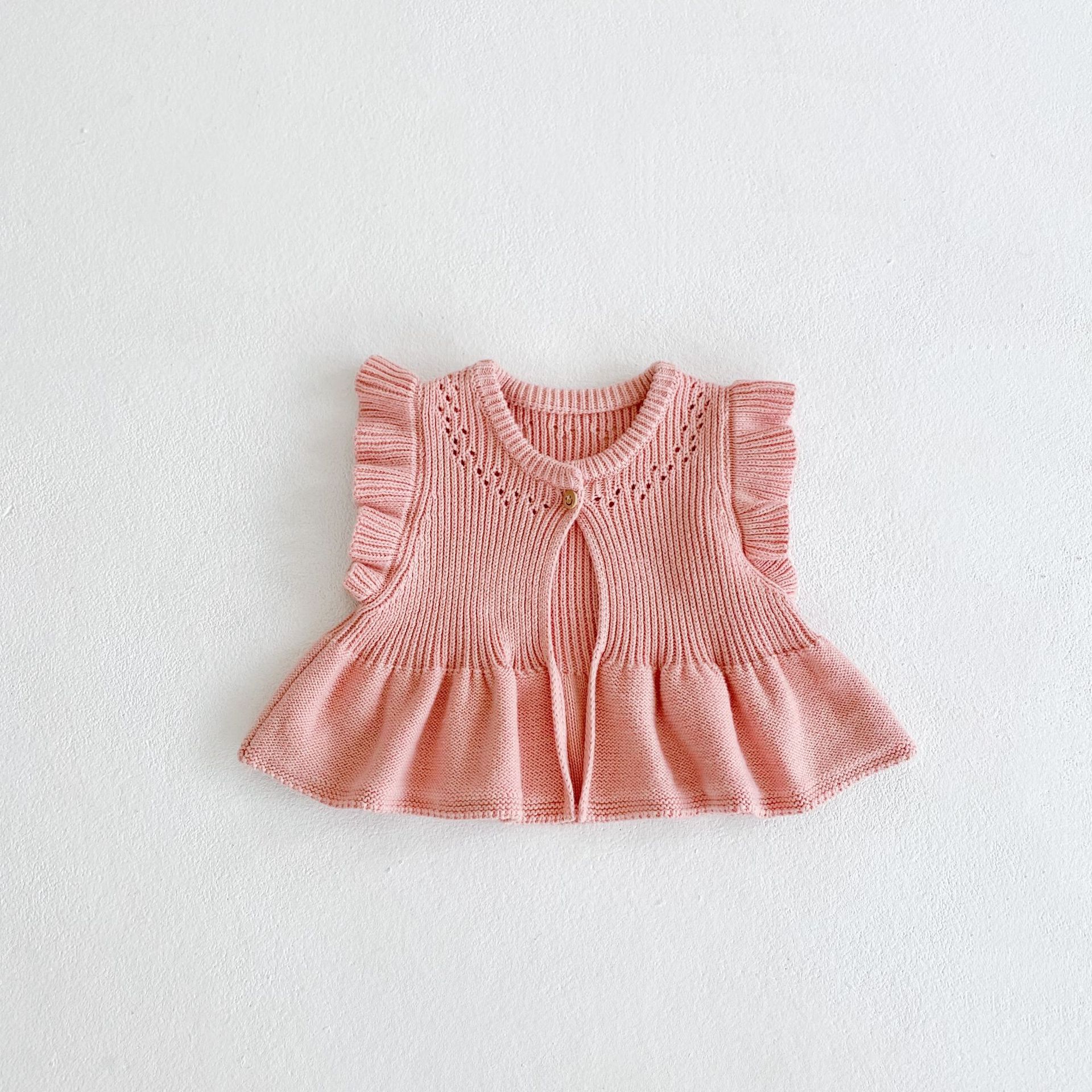 2023 봄 의류 아기 소녀 아기 스웨터 니트 중공 비행 소매 단색 조끼 카디건 코트 다목적