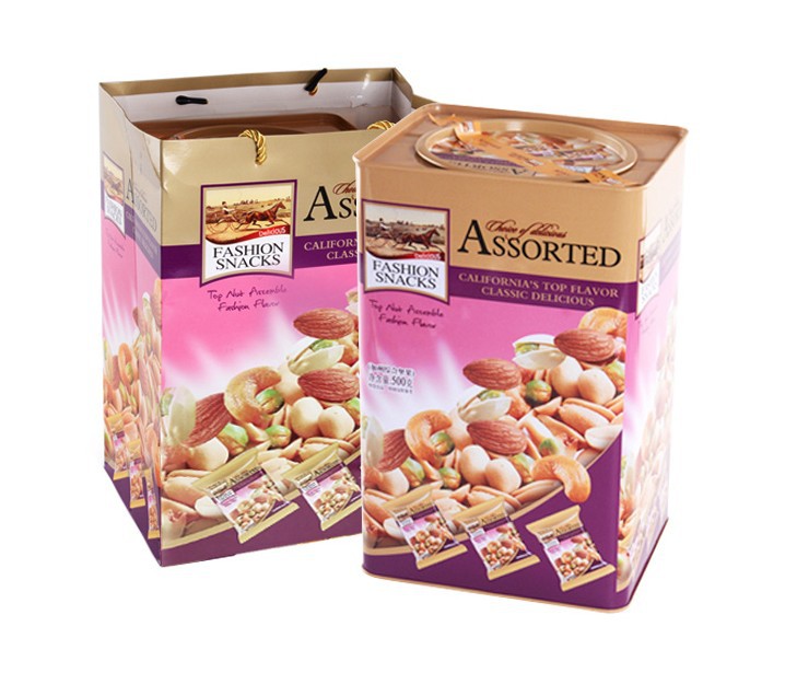 마카오 골든 랭귀지 캘리포니아 종합 혼합 너트 선물 상자 500g 연간 상품 핸드백과 종합 너트 철 양동이