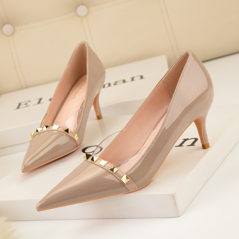 869-1 유럽과 미국 섹시 슬림 투명 하이힐 스틸레토 힐 하이힐 에나멜 가죽 얕은 입 뾰족한 금속 리벳 싱글 슈즈