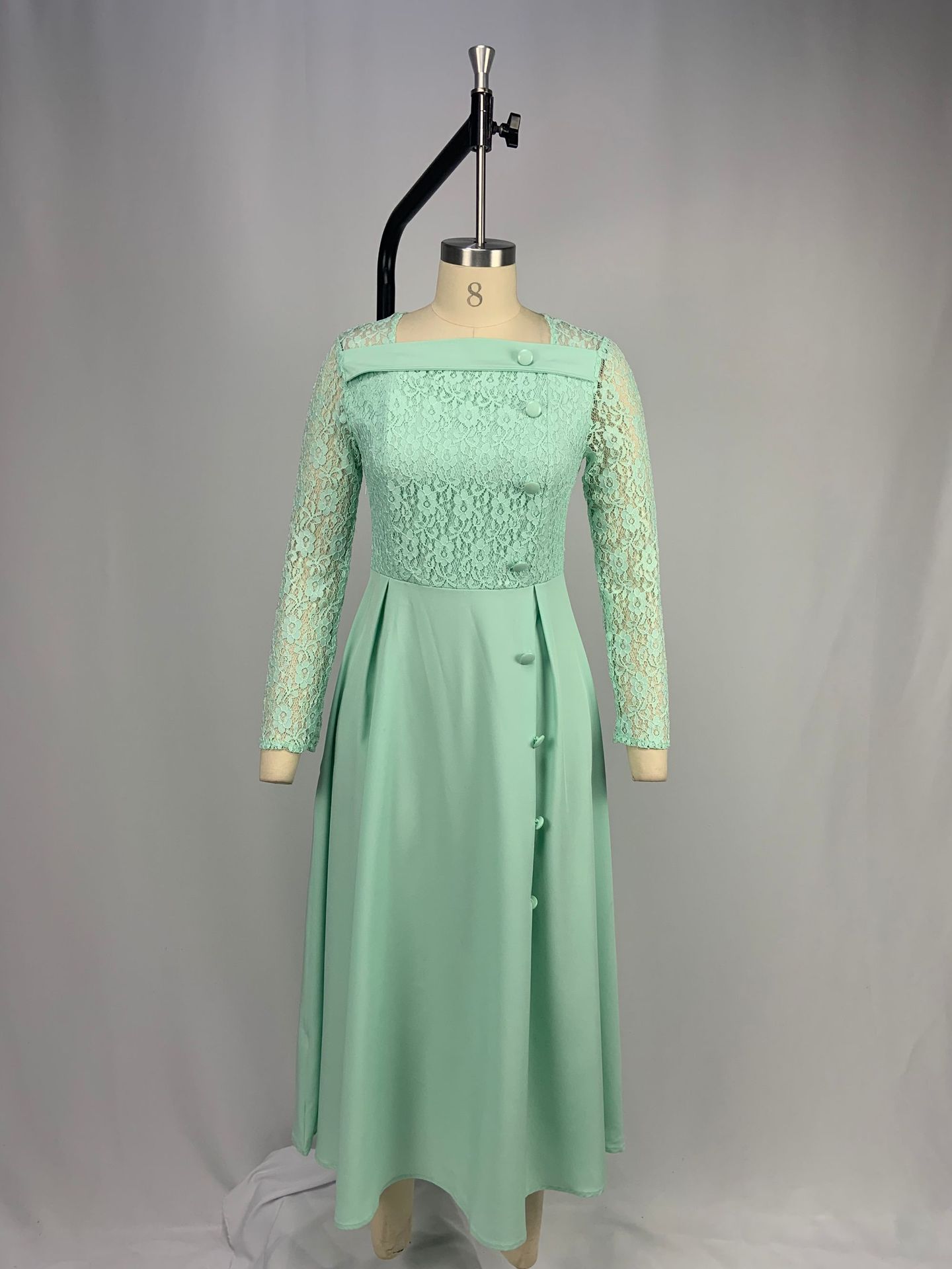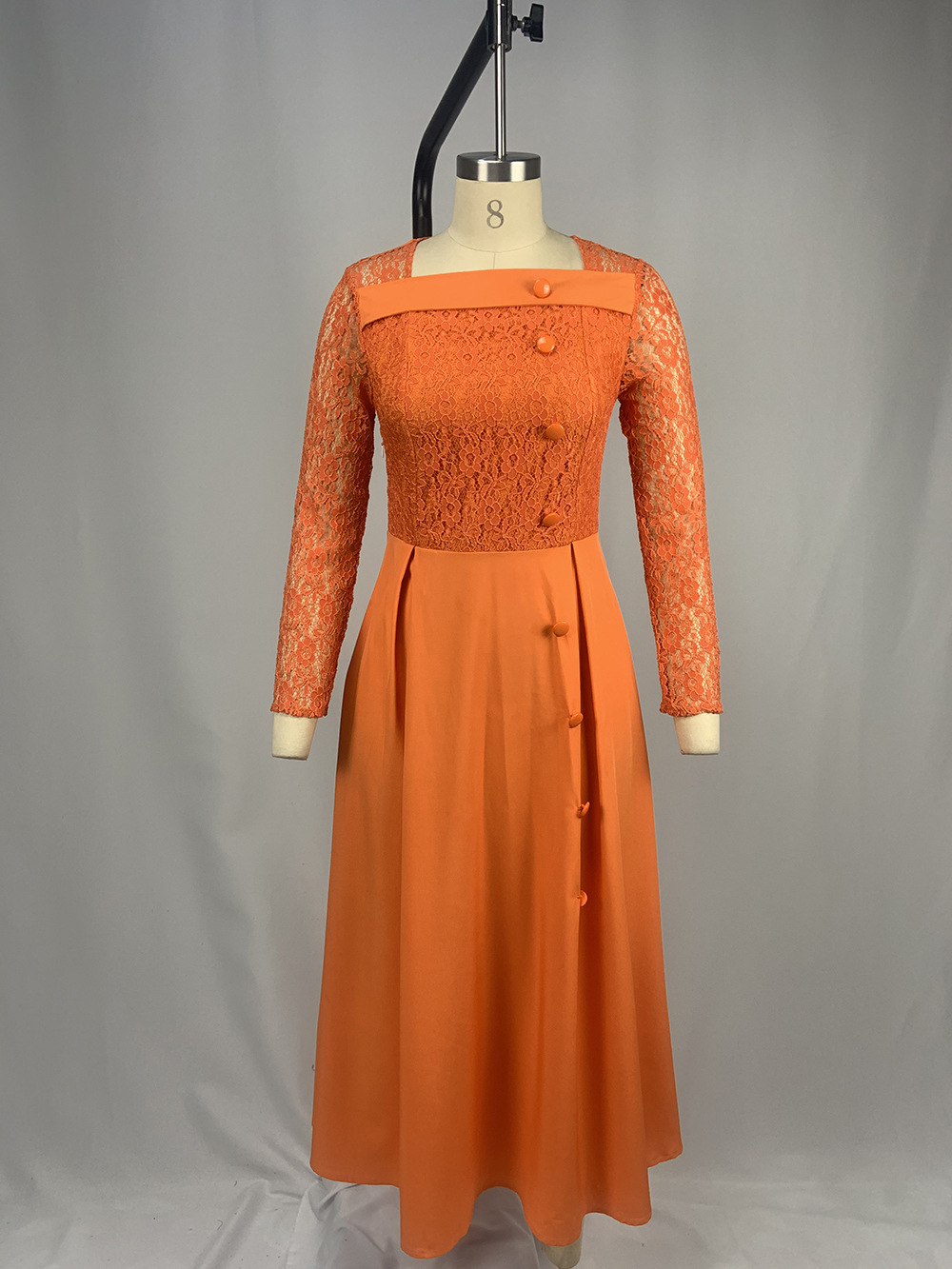 크로스 보더 플러스 사이즈 원피스 유럽과 미국 패션 라운드 넥 레이스 여자의 스커트 하이 웨이스트 긴 소매 인쇄 중간 길이 원피스스토어 가기