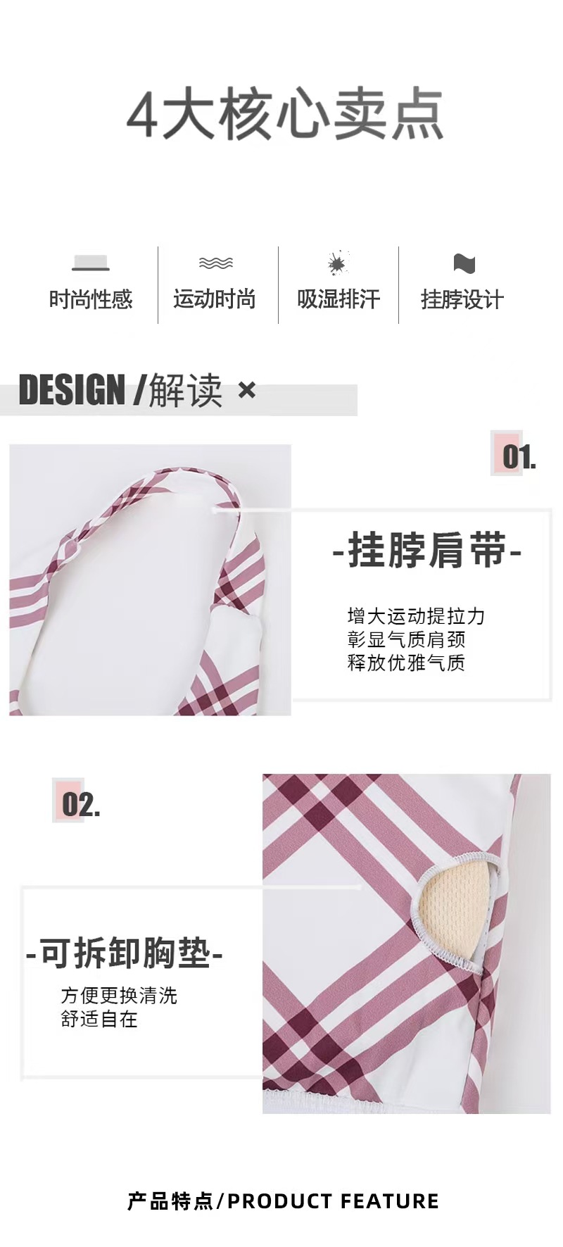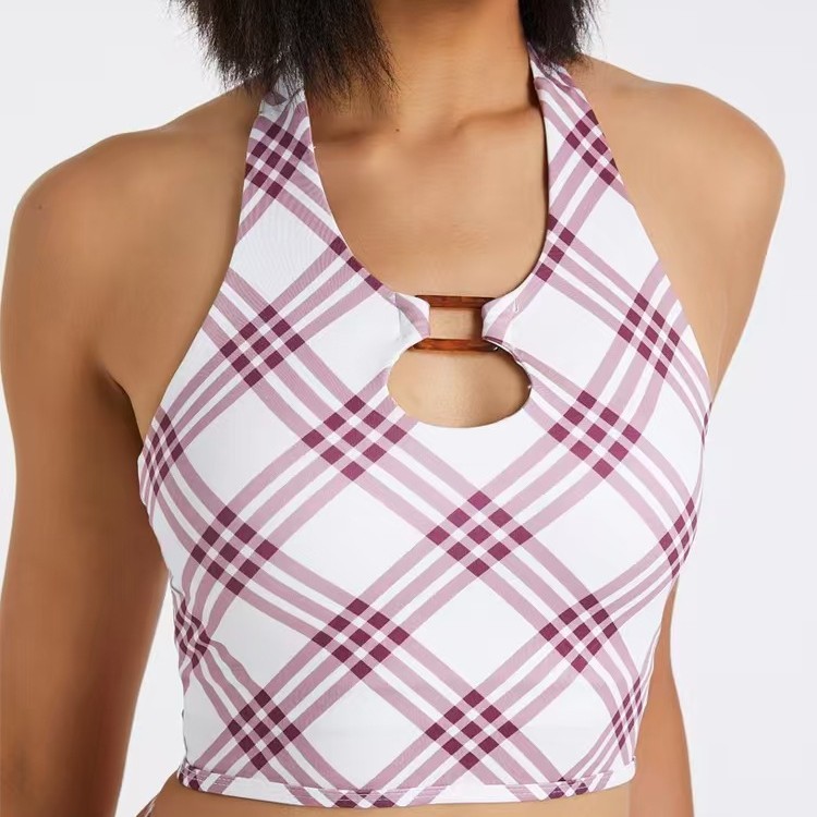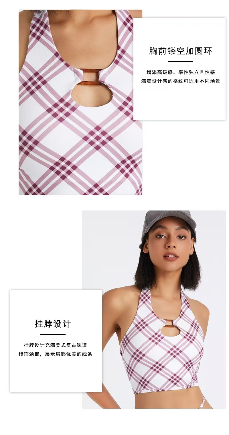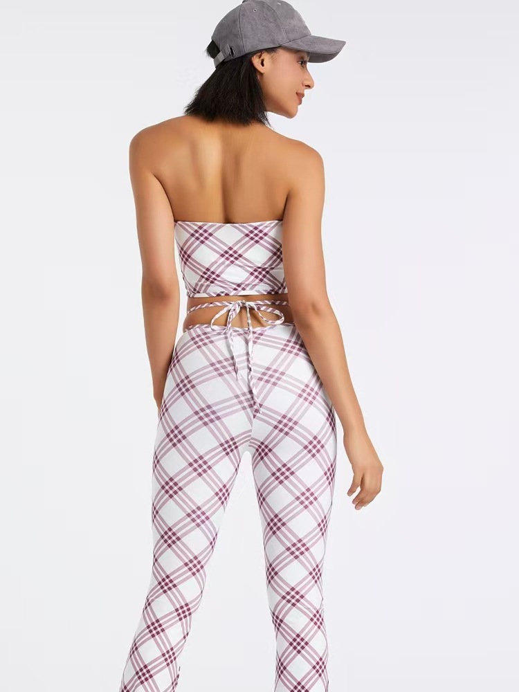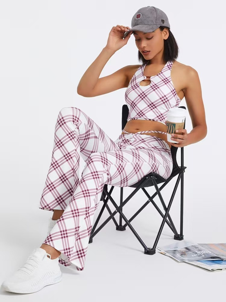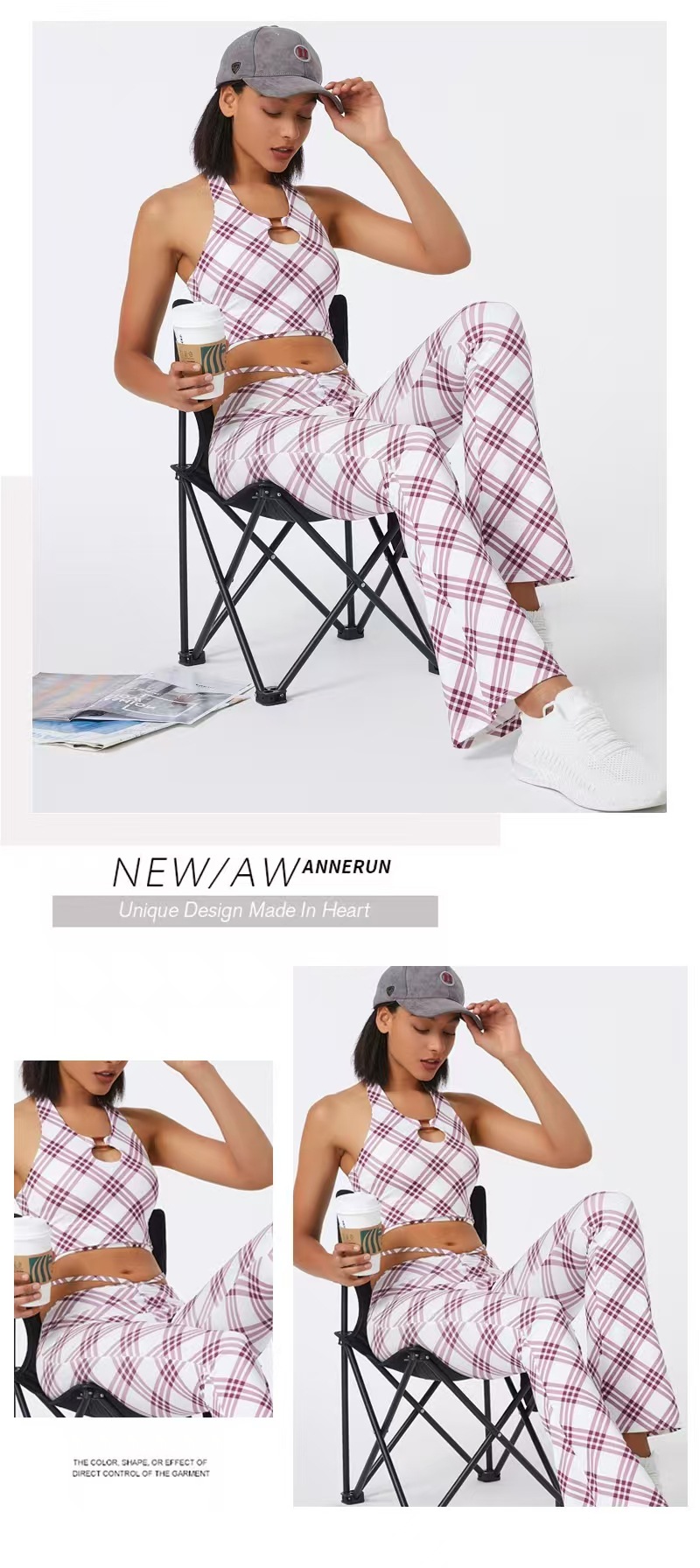 고급스럽고 섹시하며 패셔너블한 여성용 체크무늬 요가복 세트, 가슴 패드가 있는 홀터넥 탱크탑과 조임끈이 있는 스포츠 피트니스 플레어 팬츠