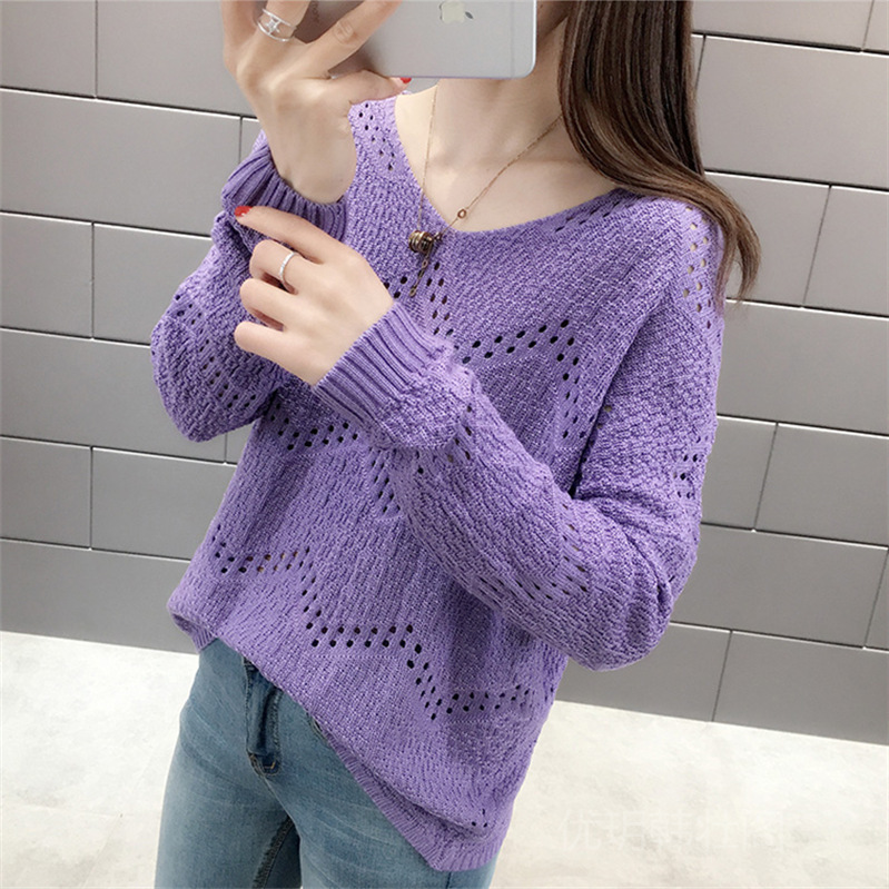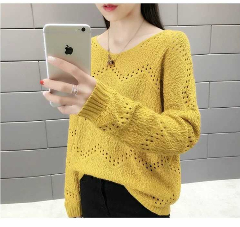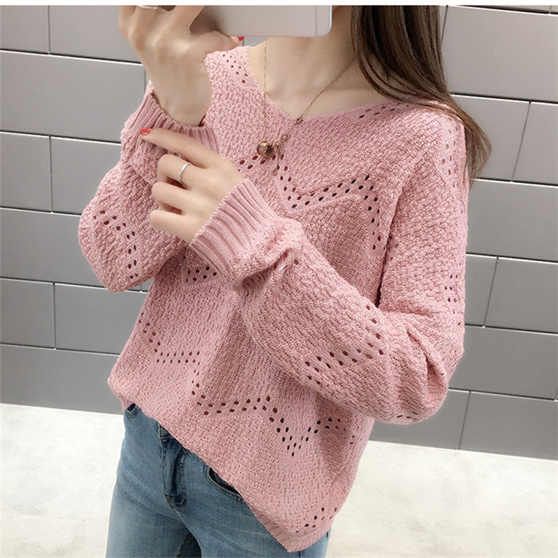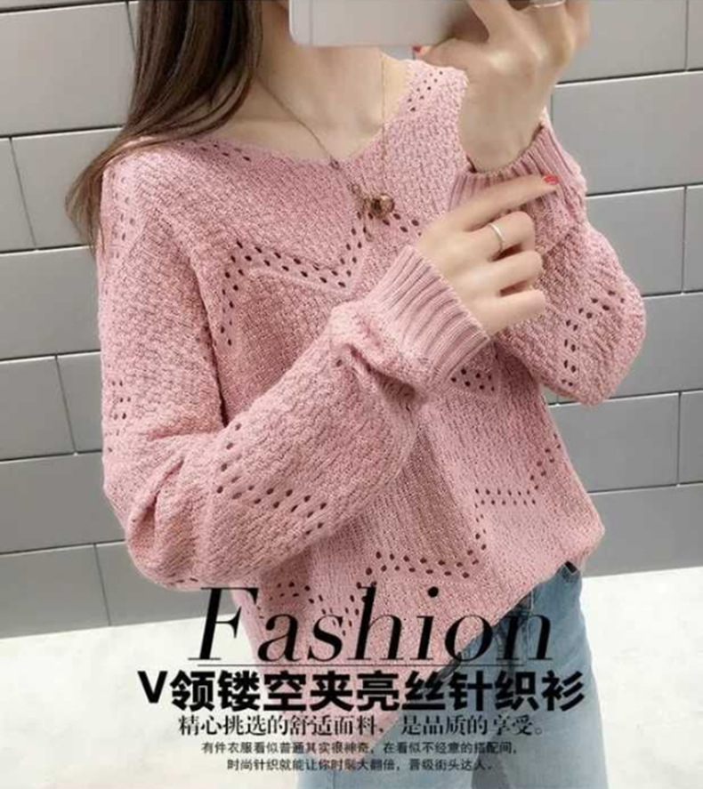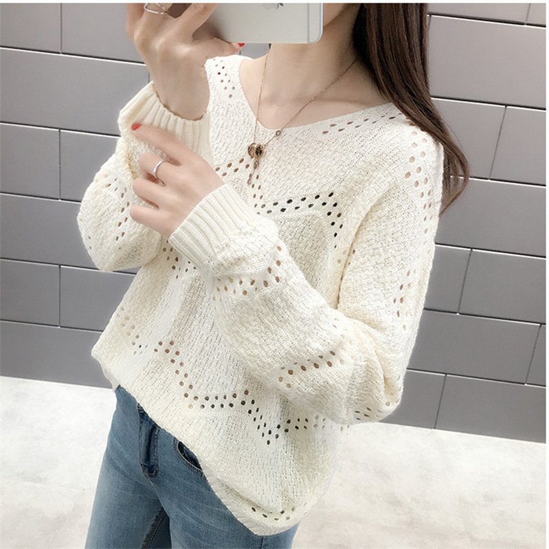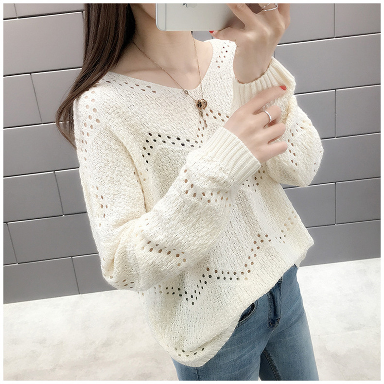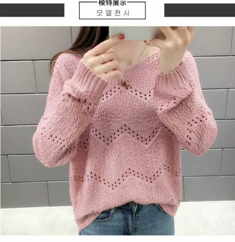 2023 봄과 가을 새로운 V-넥 중공 니트 스웨터 세련된 크루넥 스웨터 여성용 느슨한 얇은 블라우스 베이스 탑스토어 가기