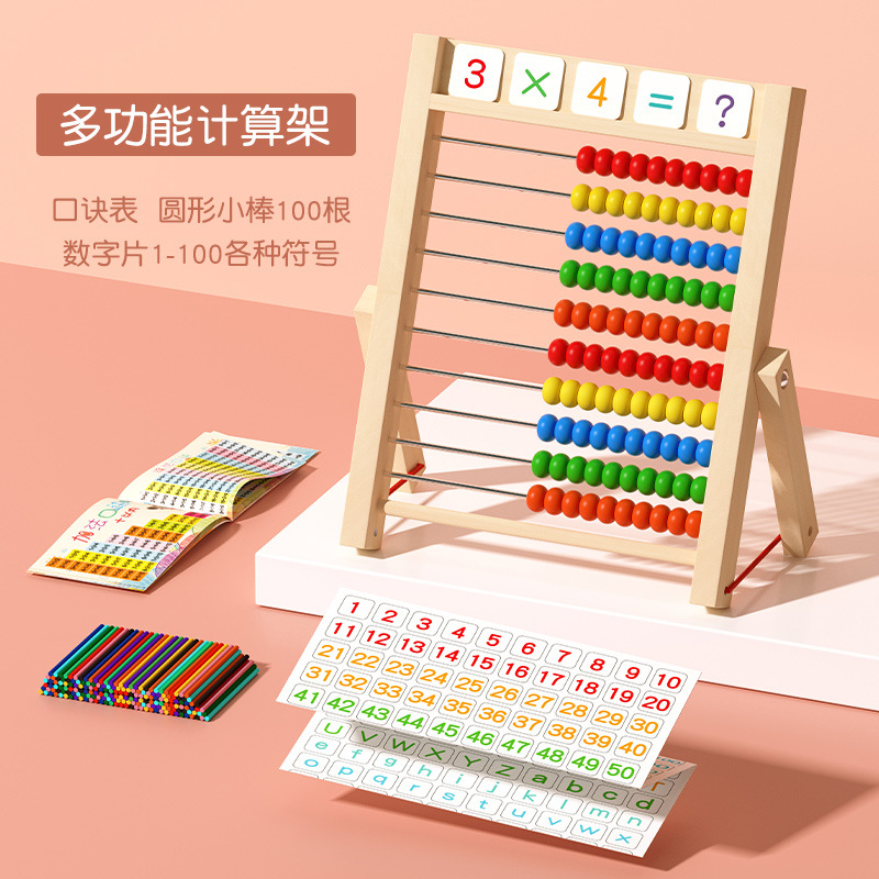 产品名称:多功能10档计算架(木珠) 含(110张数字加减乘除等等+100根数数棒+口诀表)(CE/CPC)