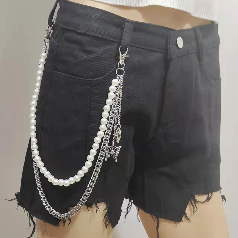 韩国INS原宿风个性街拍牛仔裤珍珠链搭蝴蝶桃心吊坠男女同款腰链