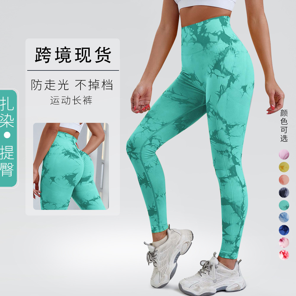 재고! 유럽 및 미국 타이 다이 하이 웨이스트 피트니스 바지 복숭아 힙 요가 바지 스포츠 타이트 팬츠 여성용 속건 발목 길이 바지