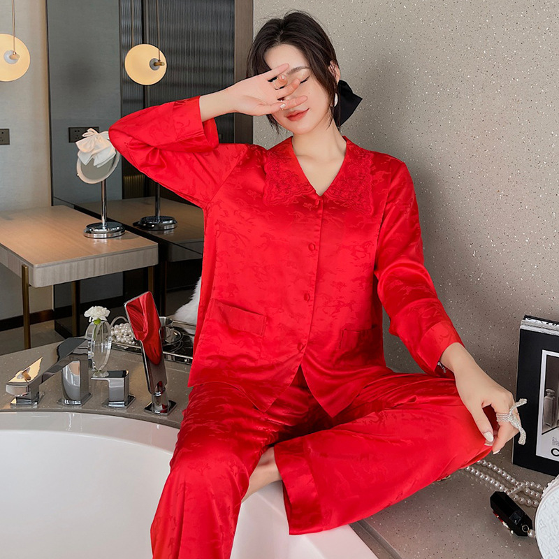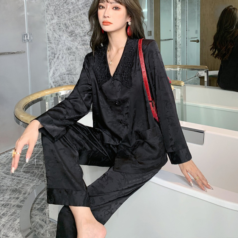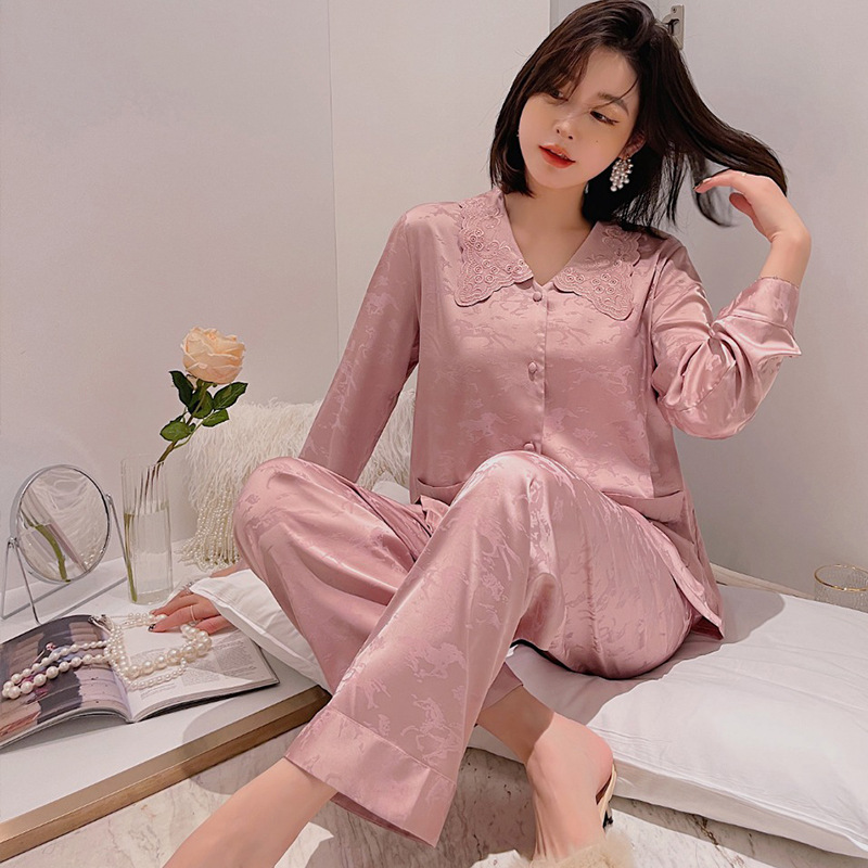 2023 새로운 잠옷 여자의 봄과 가을 긴 소매 얇은 인형 칼라 자카드 아이스 실크 세트 단색 고급 감각 홈 옷스토어 가기