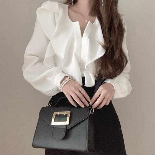 한국 인 우아한 우아한 이른 봄 세련된 모든 매치 루즈한 러플 긴팔 셔츠 여성용 화이트 베이스 셔츠스토어 가기