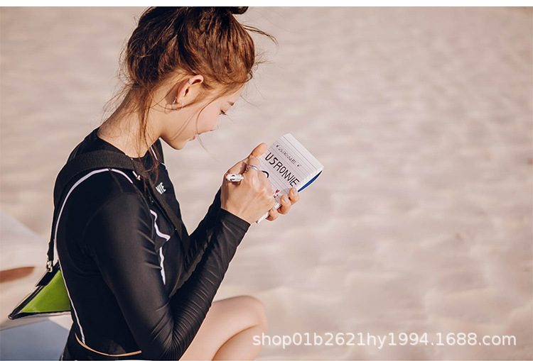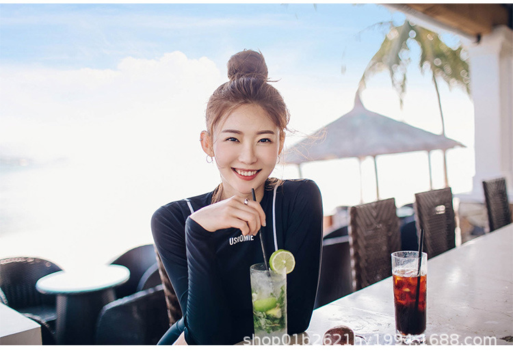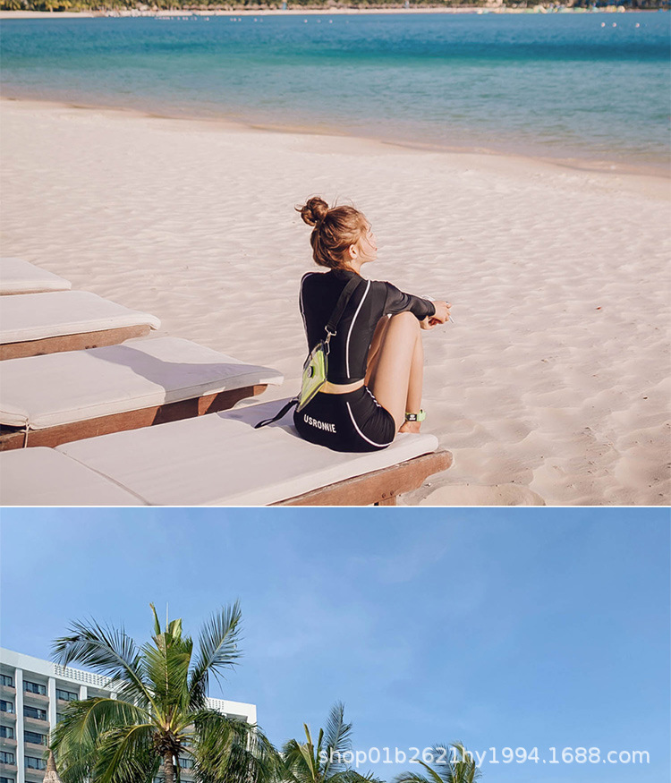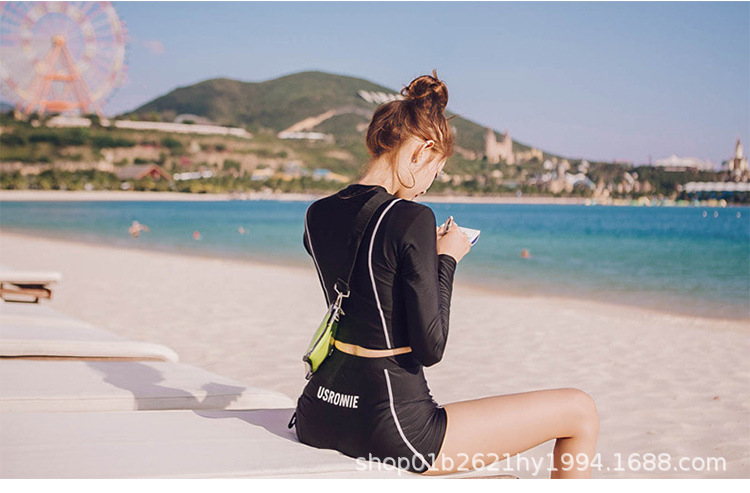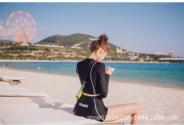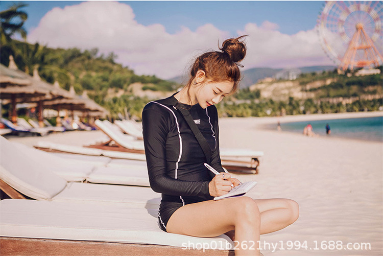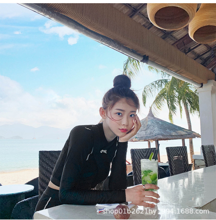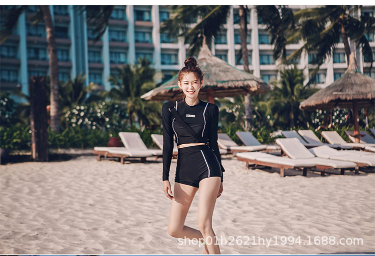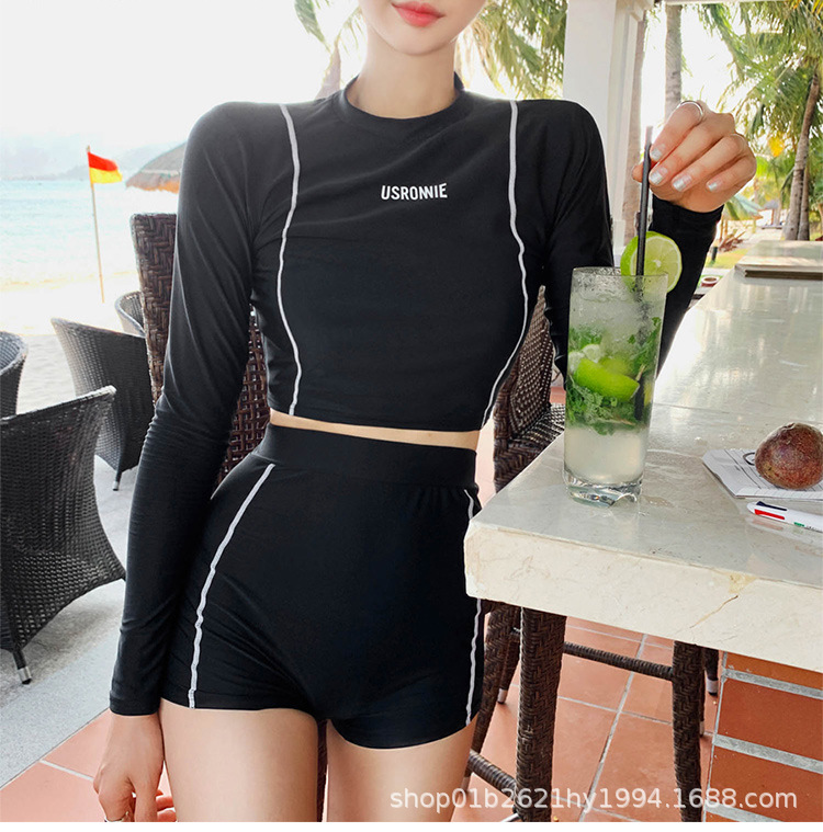 한국의 새로운 하이 웨이스트 스플릿 블랙 긴팔 작은 복서 보수적 슬리밍 투피스 여성 자외선 차단 수영복스토어 가기