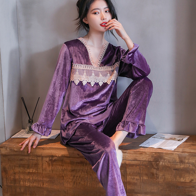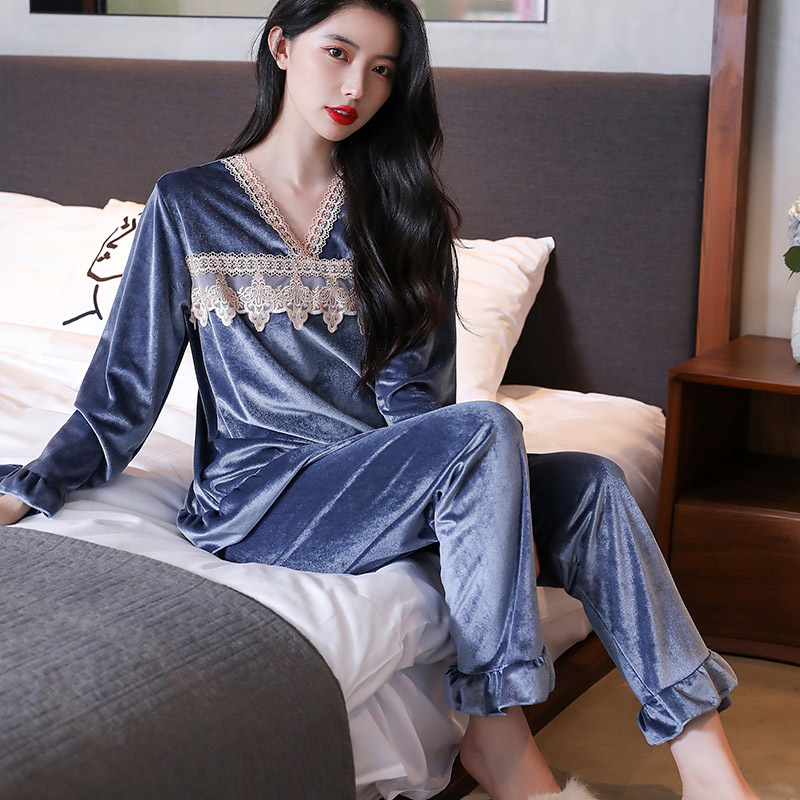 새로운 황금 벨벳 잠옷 여자의 가을과 겨울 가정 옷 달콤한 귀여운 샤넬 긴 소매 바지 봄과 가을 투피스 세트