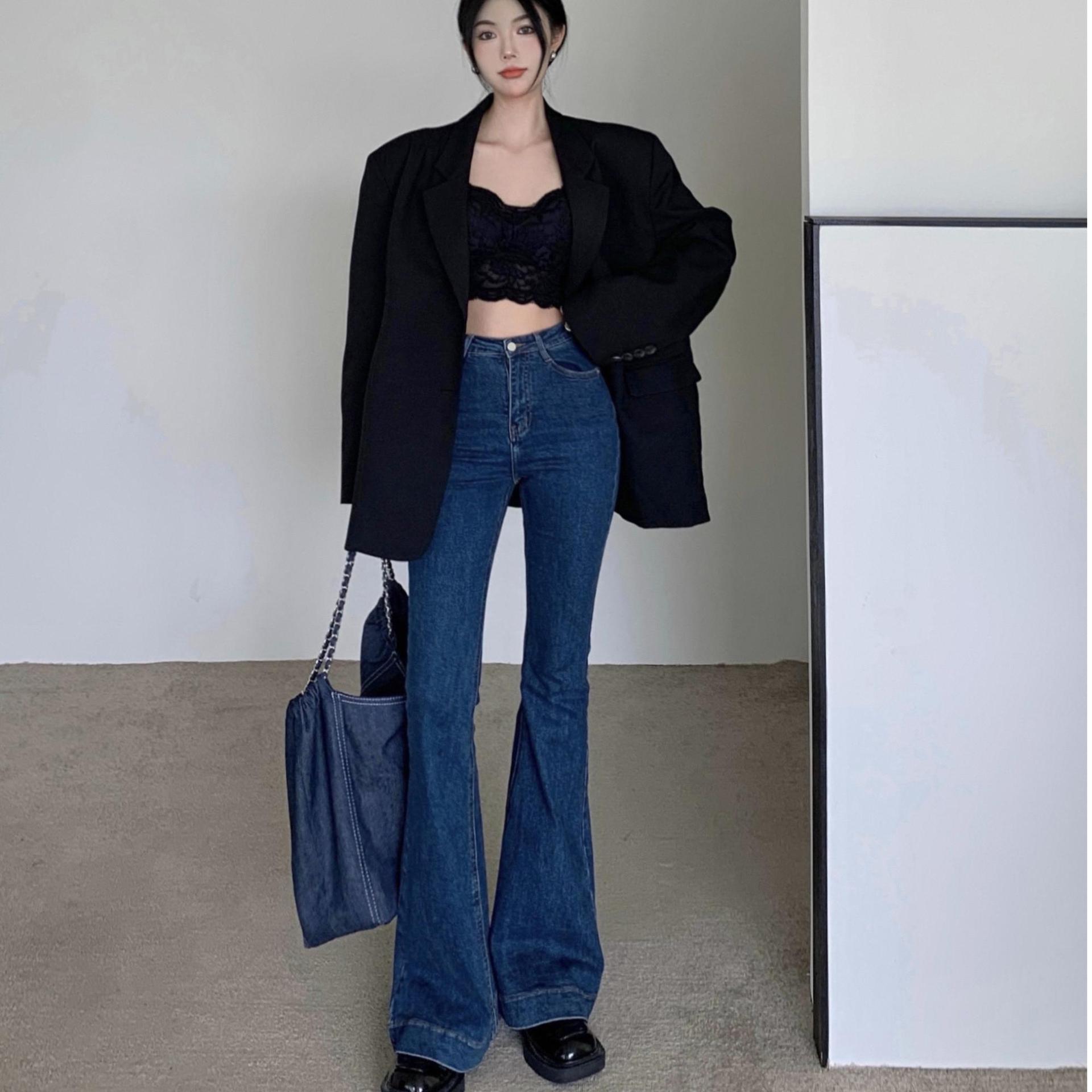 미국 빈티지 다크 블루 높은 허리 플라 바지 여성용 가을과 겨울 스트레치 슬림핏 슬리밍 타이트 힙 리프트 청바지스토어 가기
