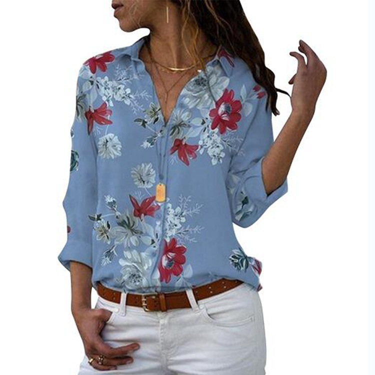 국경 간 가을과 겨울 유럽과 미국의 새로운 플러스 사이즈 느슨한 인쇄 여성 셔츠 깊은 V 멀티 버튼 쉬폰 긴 소매 셔츠 여성스토어 가기