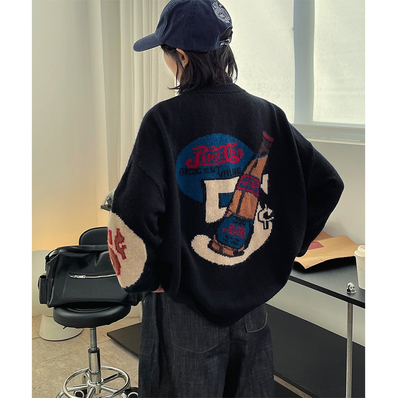 겨울 새로운 한국 스타일 디자인 야구 세트 재미 패턴 니트 카디건 슬리밍 여성을위한 부드러운 두꺼운 스웨터