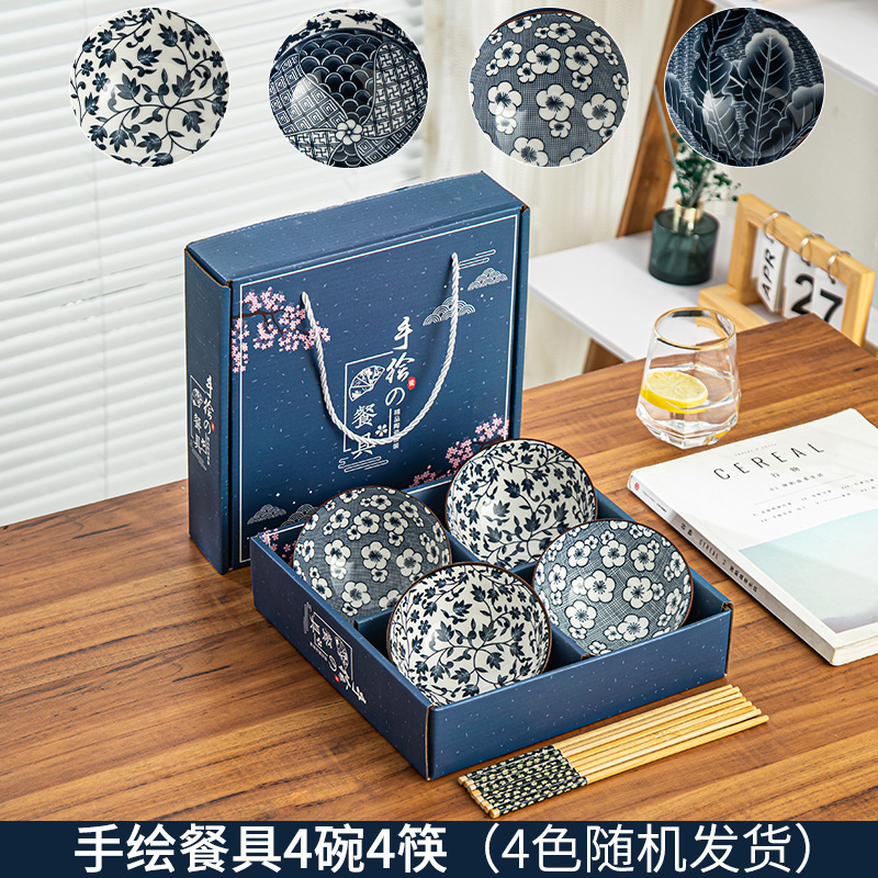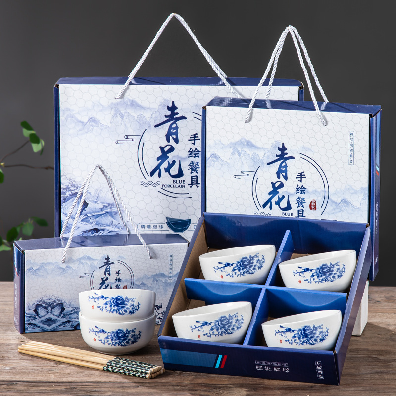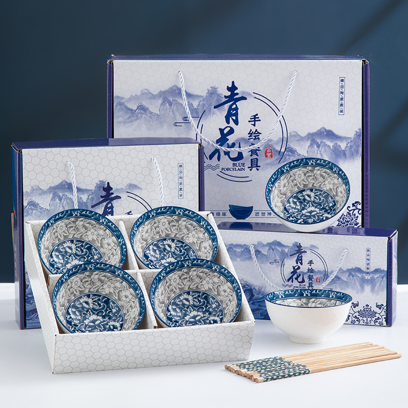 • 손으로 그린 ​​파란색과 흰색 그릇과 젓가락 세트 선물 상자
