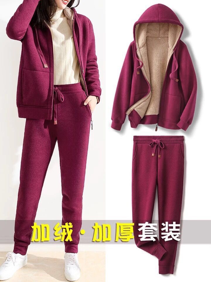 스포츠 캐주얼 세트 여자의 겨울 기모 두꺼운 간단한 단색 슬리밍 긴 소매 후드 짧은 재킷 유행 스포츠 바지스토어 가기