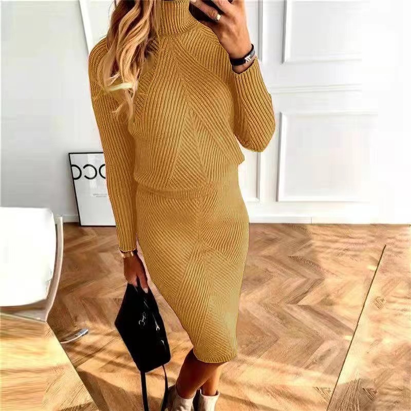 알리익스프레스 가을 겨울 신상 여성복 유럽 및 미국 스타일 하이넥 니트 단색 두꺼운 라펠 풀오버 스웨터 세트