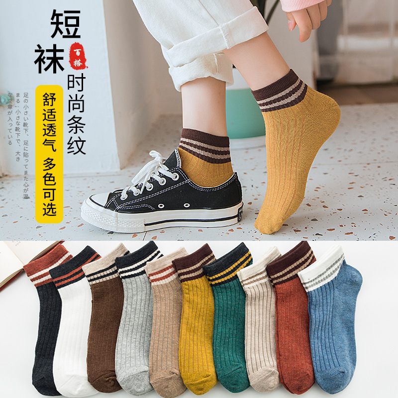 짧은 튜브 봄과 여름 양말 폴리 에스테르 면 양말 숙녀 배 양말 일본 대학 스타일 평행 막대 줄무늬 양말 어린이 짧은 양말 도매스토어 가기