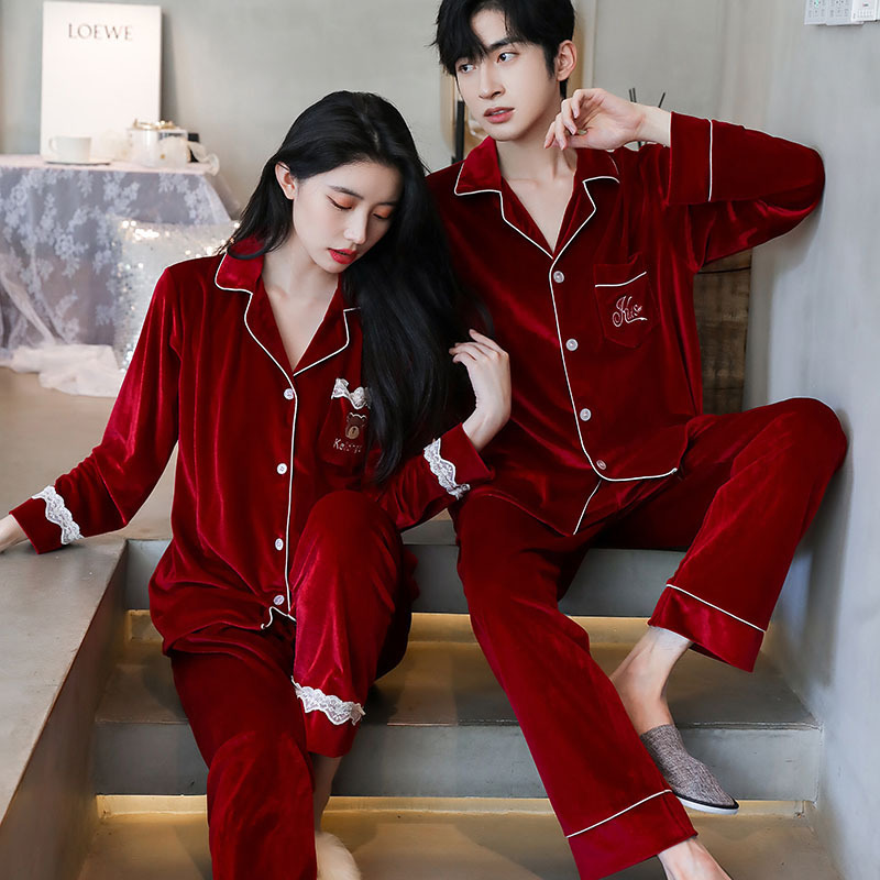 커플 잠옷 골드 벨벳 가을과 겨울 긴 소매 단색 봄과 가을 캐주얼 남성 카디건 플러스 사이즈 가정 의류 세트스토어 가기