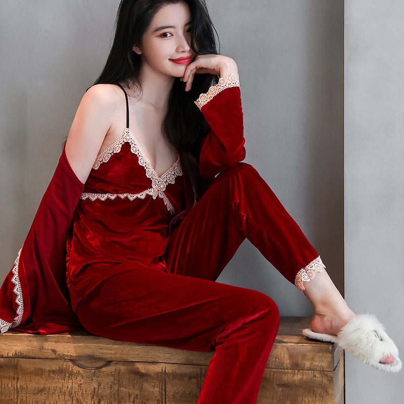 봄과 가을 긴팔 가정복 여성용 세트 레이스 사이버 연예인 섹시한 V-넥 골든 벨벳 잠옷 3 종 세트스토어 가기