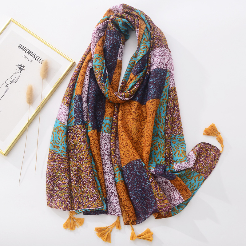 일본과 한국 스타일 복고풍 컬러 블록 스퀘어 프린트 롱 비치 타올 코튼 린넨 소프트 에스닉 스타일 자외선 차단제 숄
