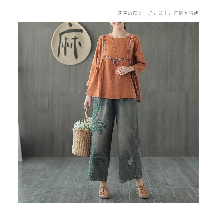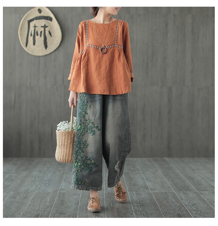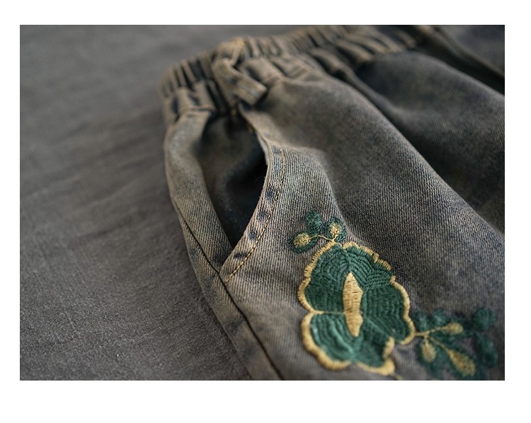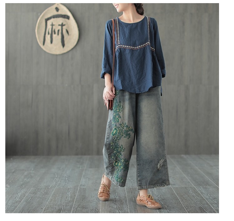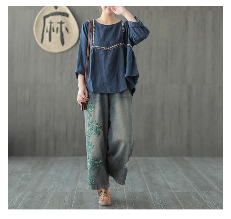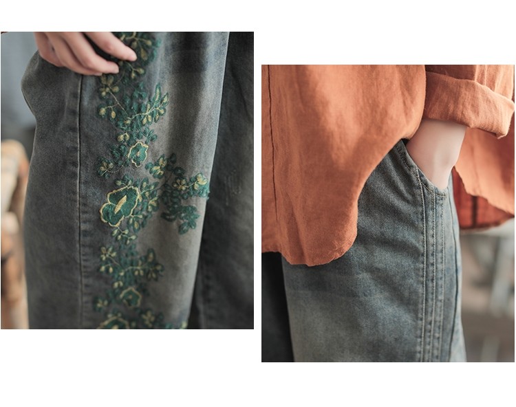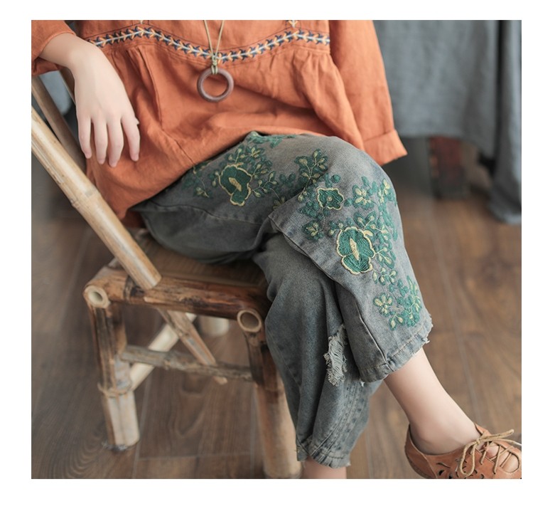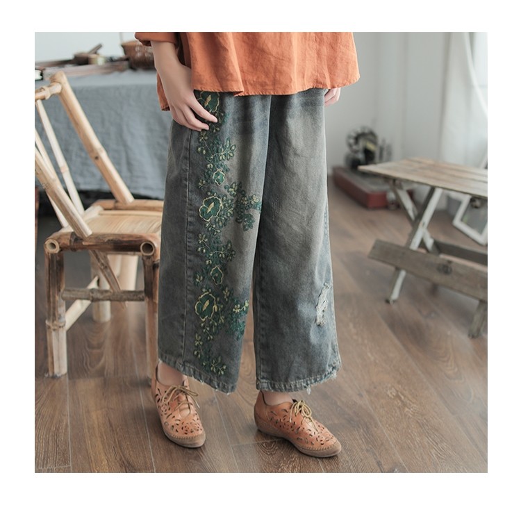 21 새로운 레트로 스트레이트 와이드 레그 팬츠 예술적 플라워 청바지 여성용 자수 레트로 느슨한 여성용 바지스토어 가기