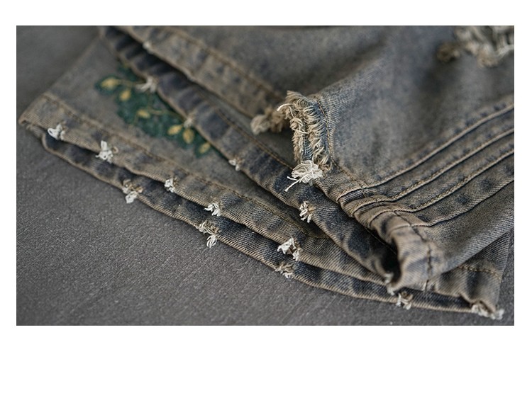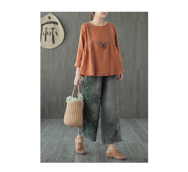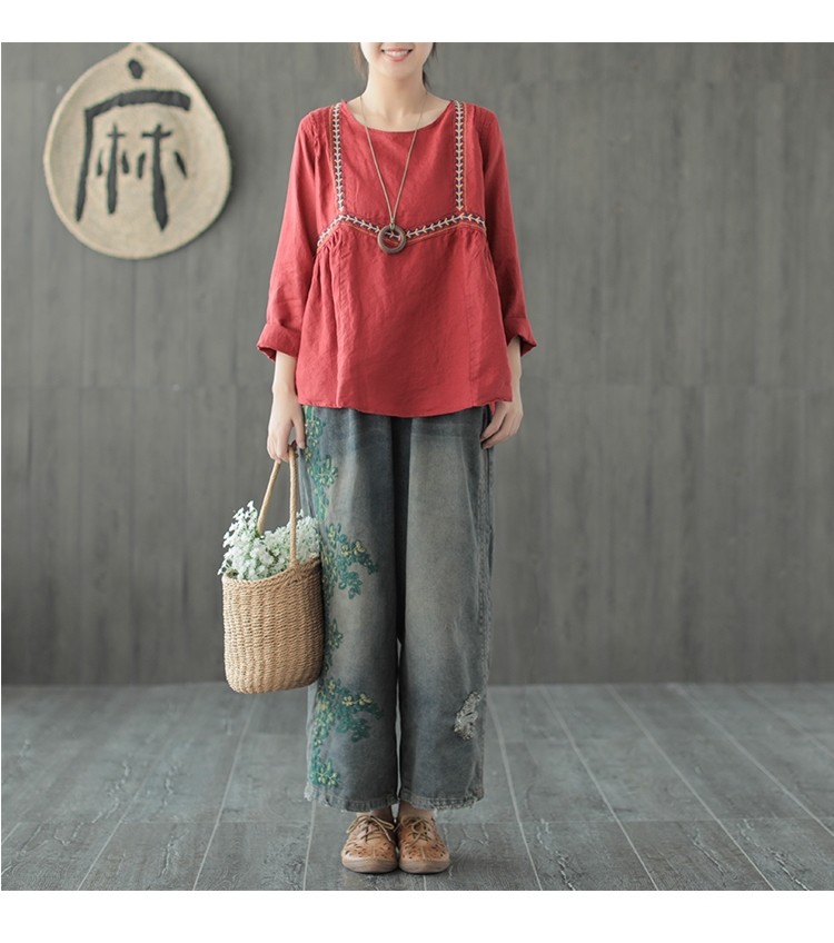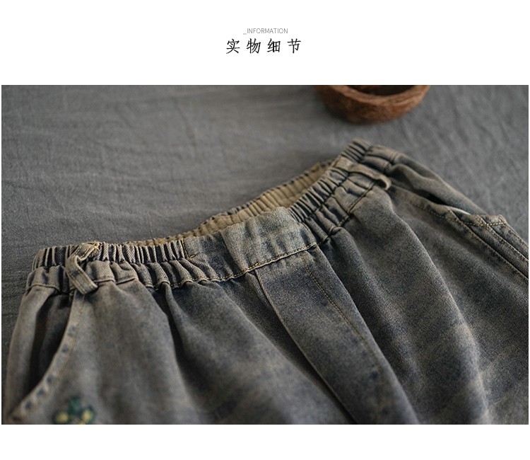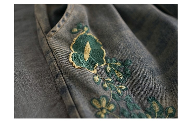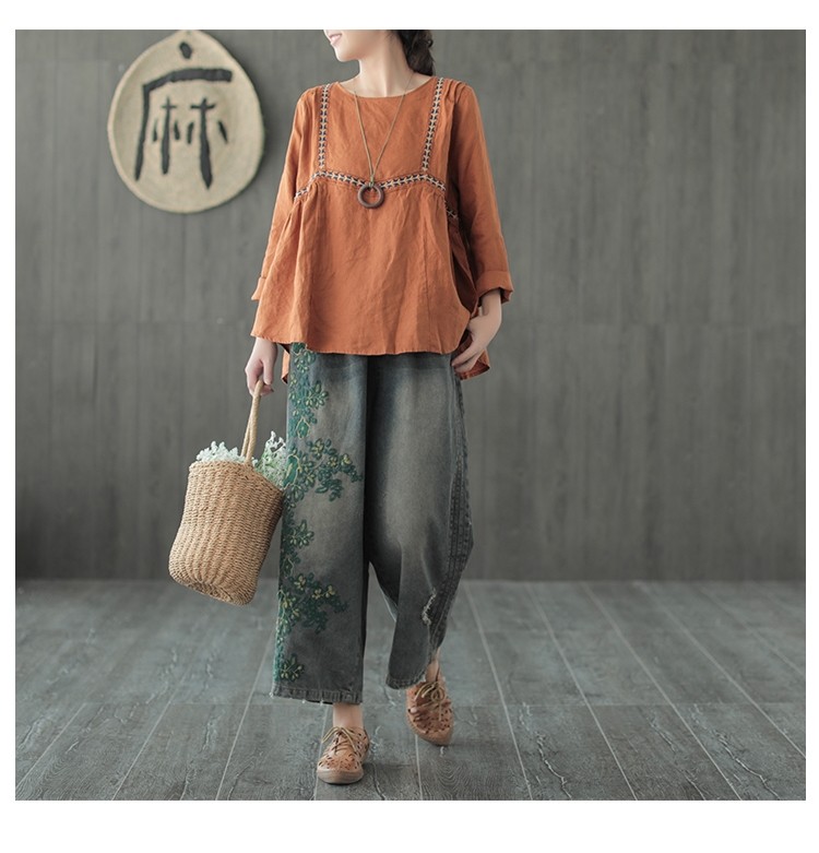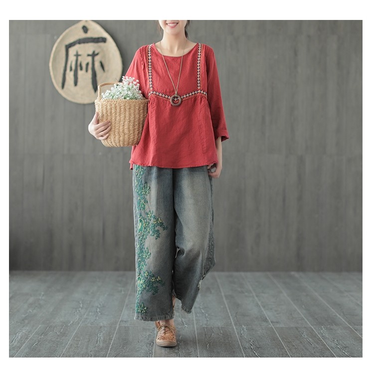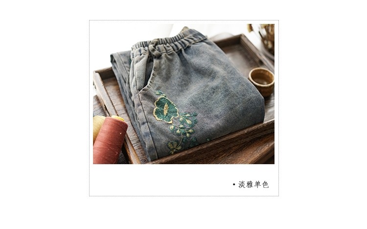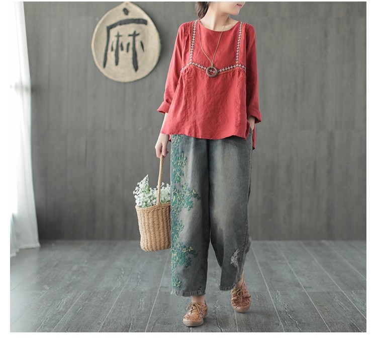 21 새로운 레트로 스트레이트 와이드 레그 팬츠 예술적 플라워 청바지 여성용 자수 레트로 느슨한 여성용 바지스토어 가기