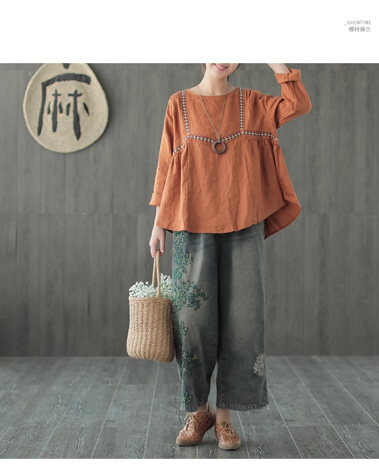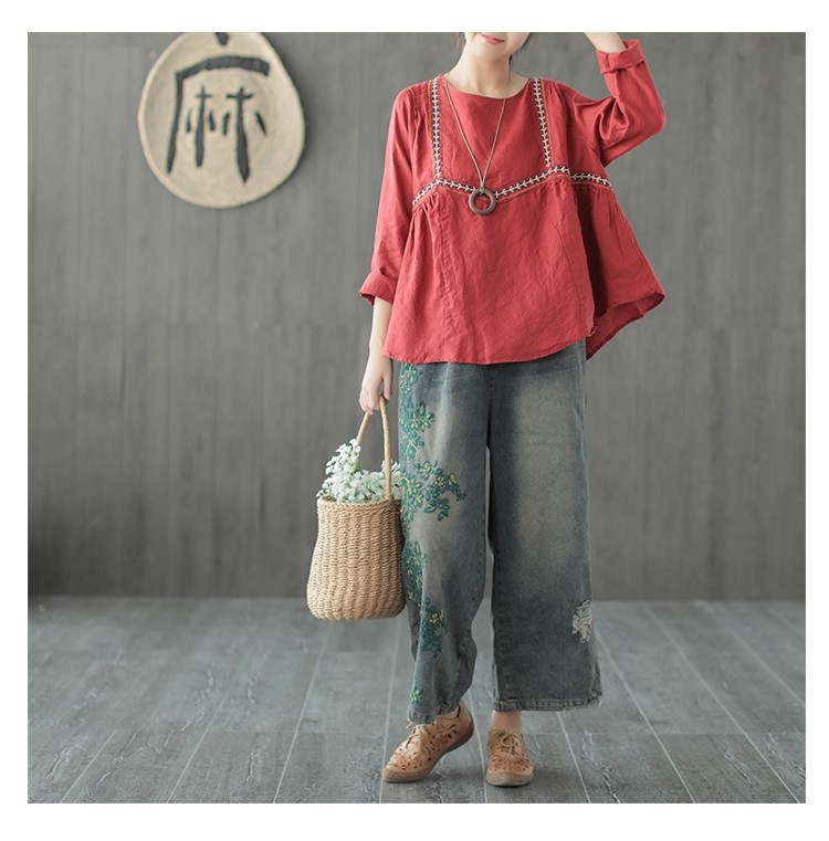 21 새로운 레트로 스트레이트 와이드 레그 팬츠 예술적 플라워 청바지 여성용 자수 레트로 느슨한 여성용 바지