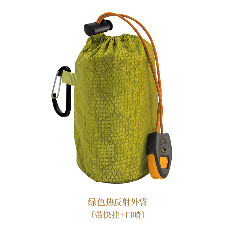 3、将急救毯套在睡袋外面,可以承担收集水源、防脏防潮、加强防风保暖等作用;烈日下也可以反光防晒;