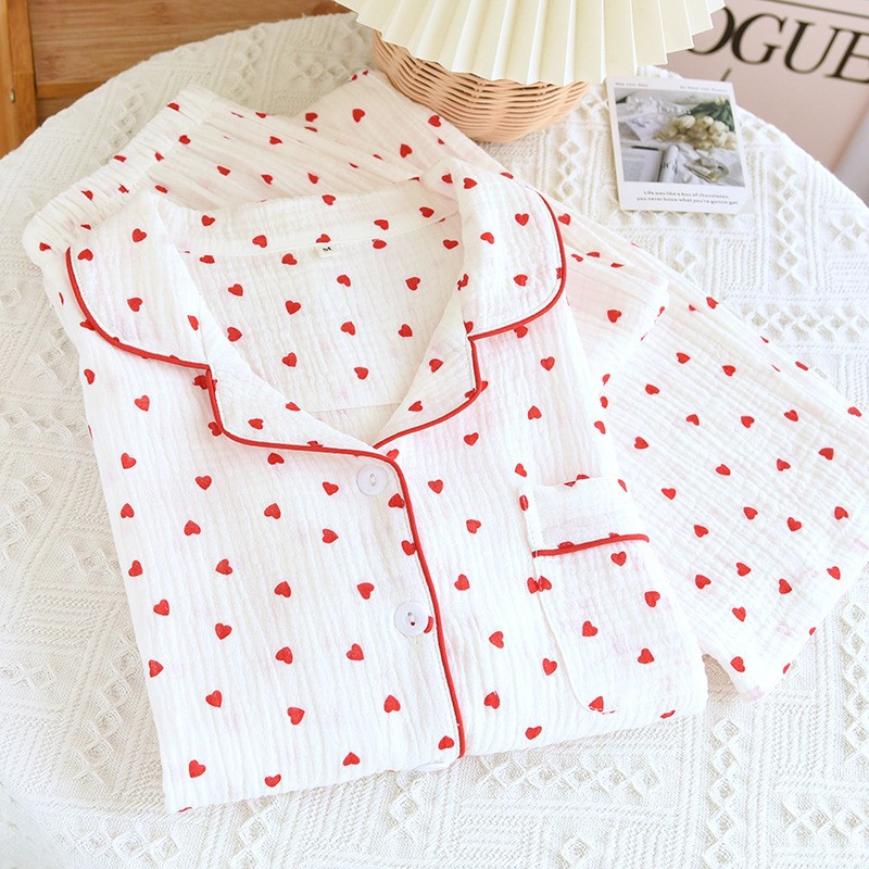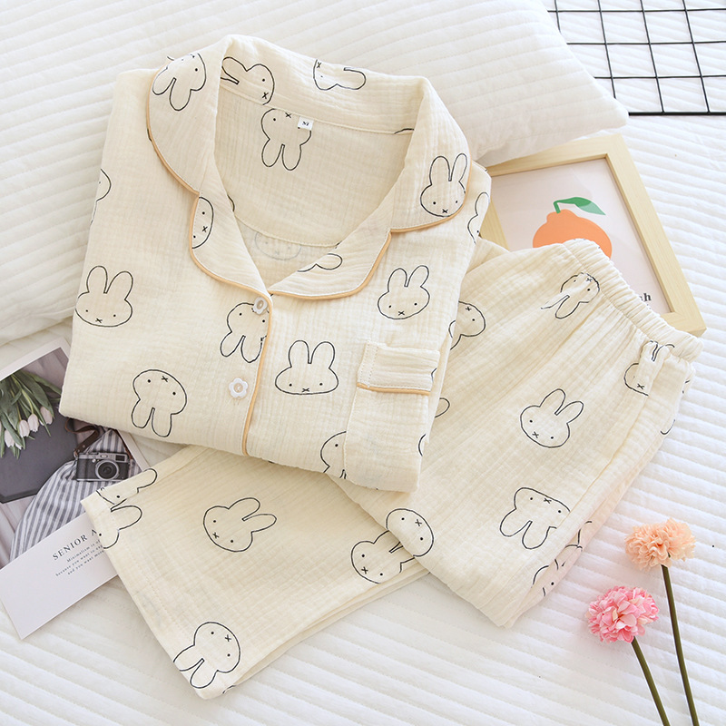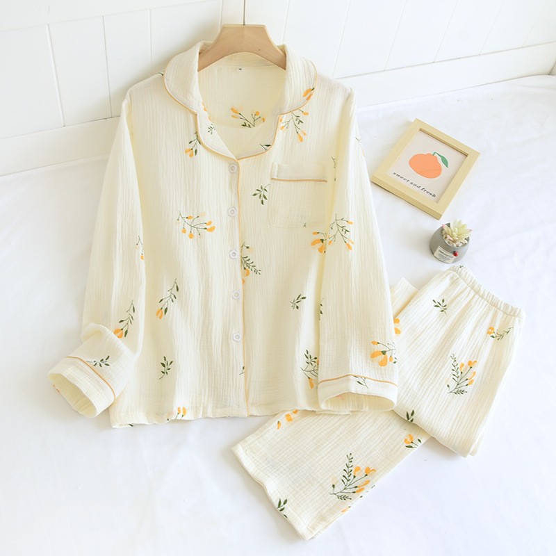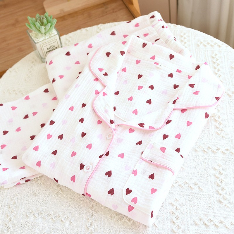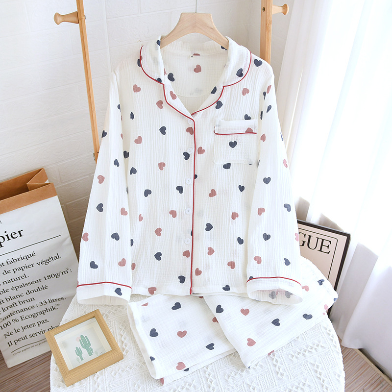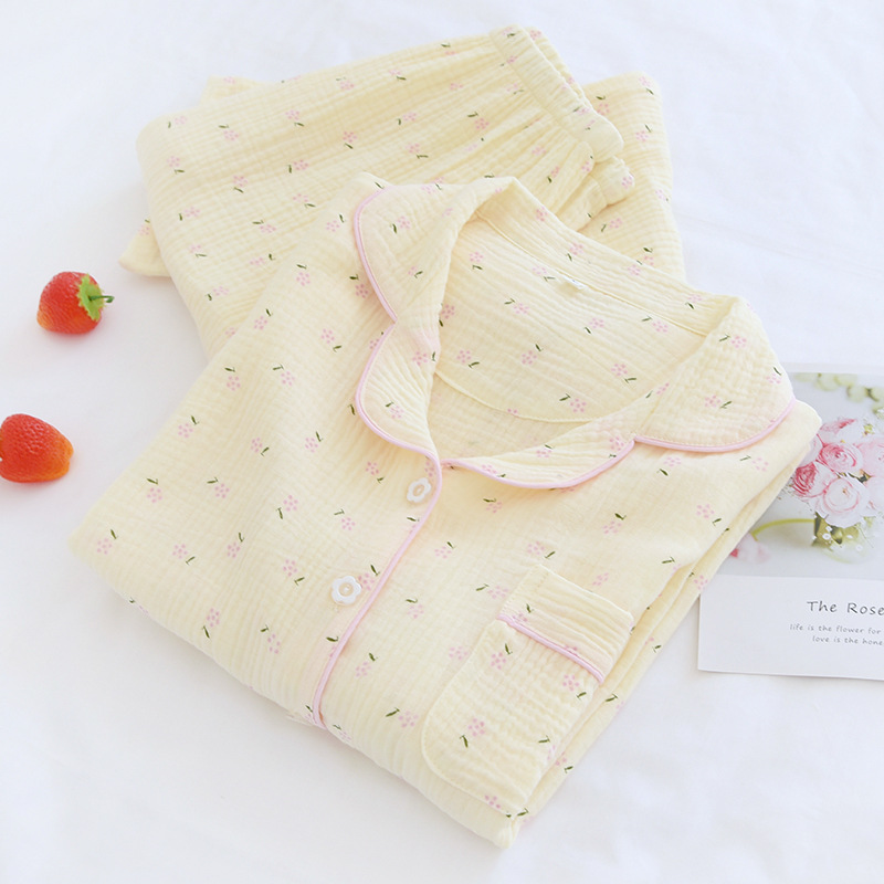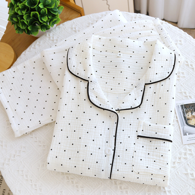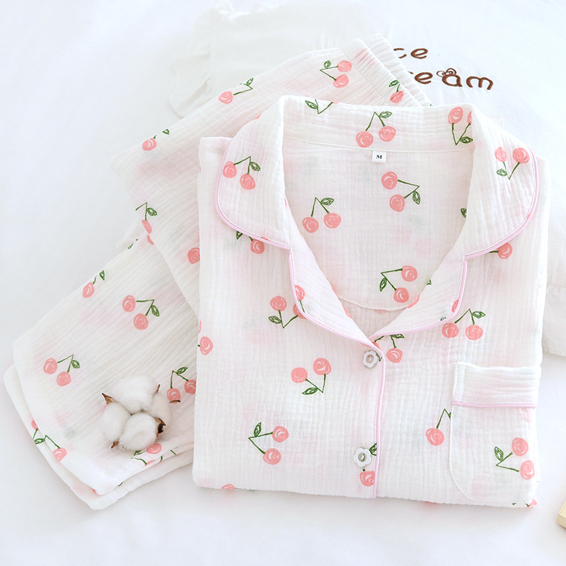 면 더블 레이어 거즈 잠옷 여자의 봄과 여름 귀여운 크레이프 카디건 긴 소매 원피스 칼라 면 거즈 플러스 사이즈 통기성스토어 가기