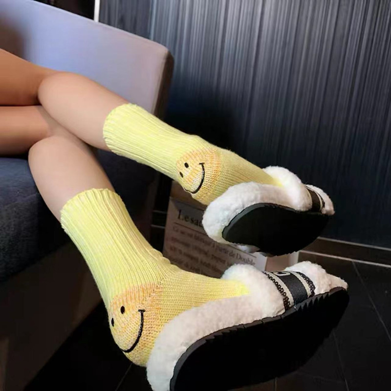 Hirata Kazuhiro 양모 두꺼운 바늘 웃는 얼굴 발 뒤꿈치 두꺼운 일본 작업복 색상 차단 줄무늬 남성과 여성 중반 송아지 양말 유행 양말