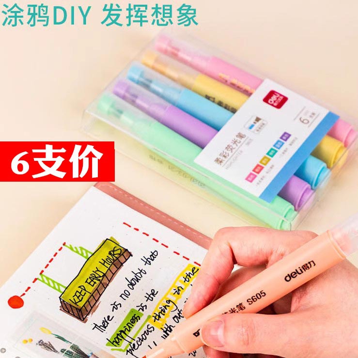 델리 S605 소프트 컬러 하이 라이터 6 색 마커 그래피티 스트로크 키 마커 노트 테이킹 로드 마카롱 색상스토어 가기