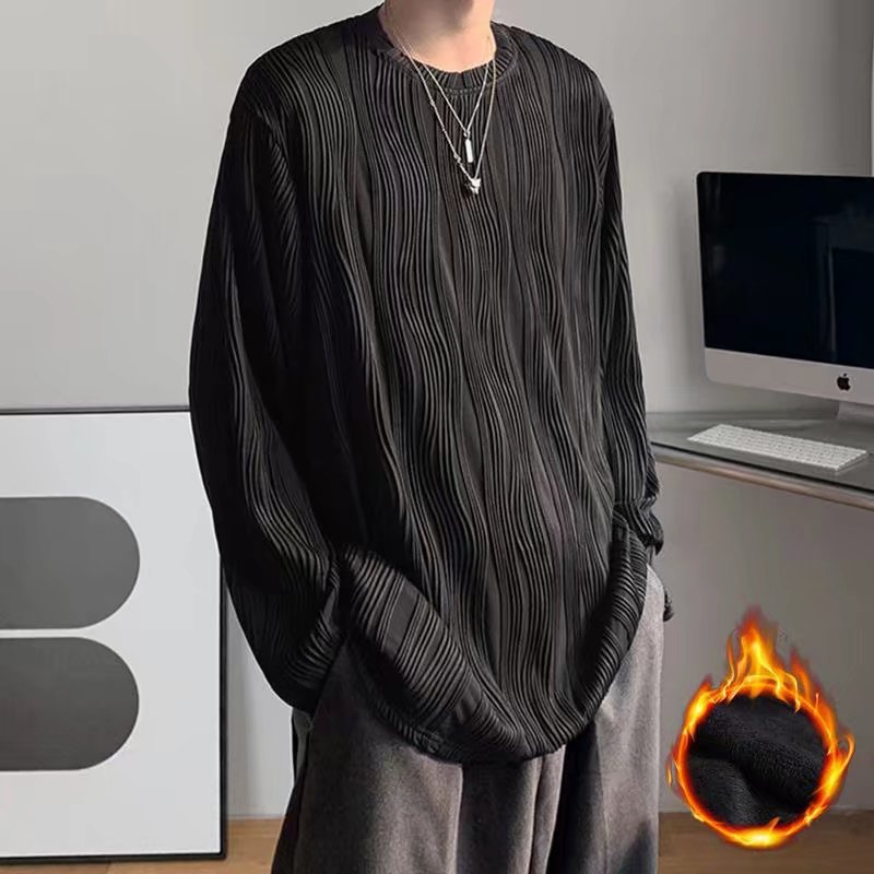화이트 플리츠 긴팔 티셔츠 남성용 느슨한 트렌디 이너베이스 셔츠 콜드 스타일 남성복 커플 기모 탑
