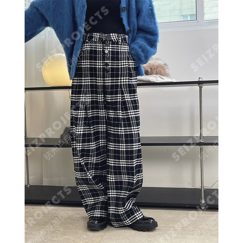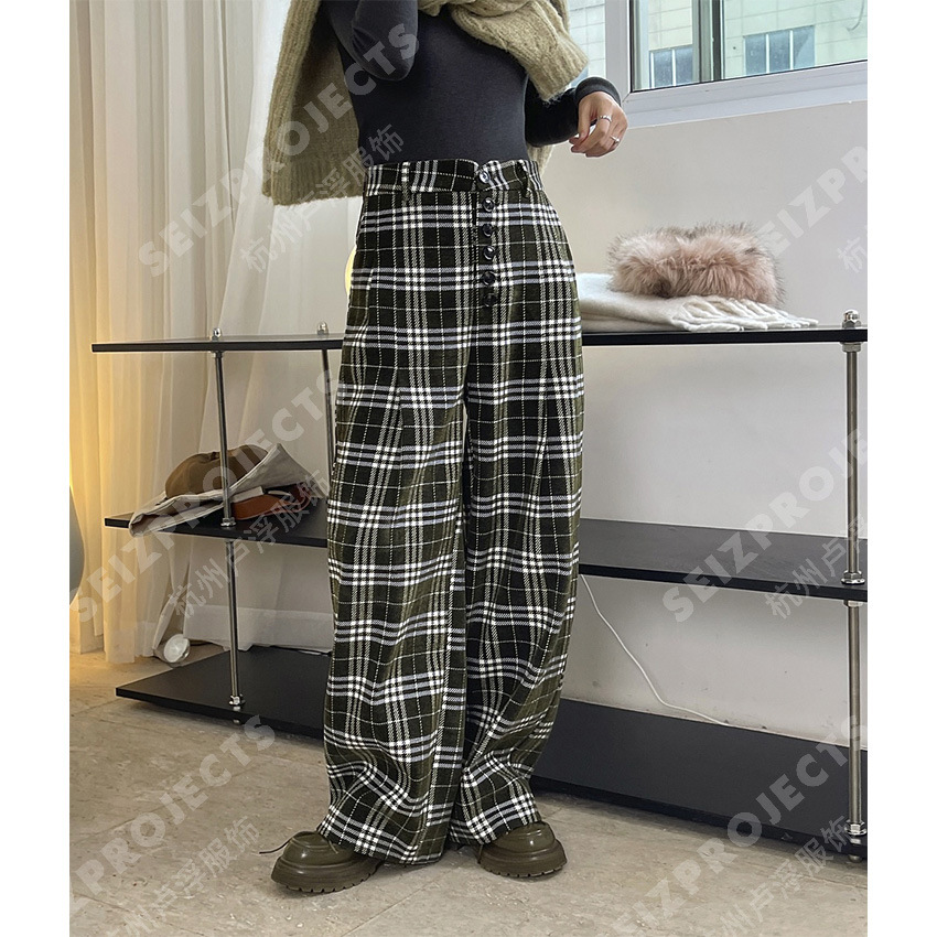 "개인" 겨울 새로운 한국 스타일 복고풍 격자 무늬 하이 웨이스트 스트레이트 캐주얼 바지 여성용 느슨한 두꺼운 바지스토어 가기