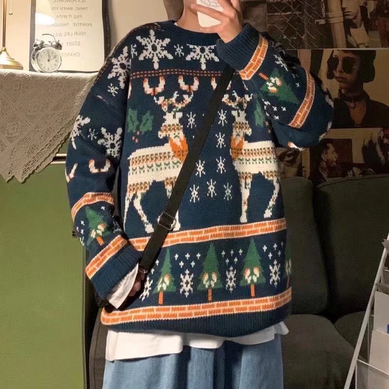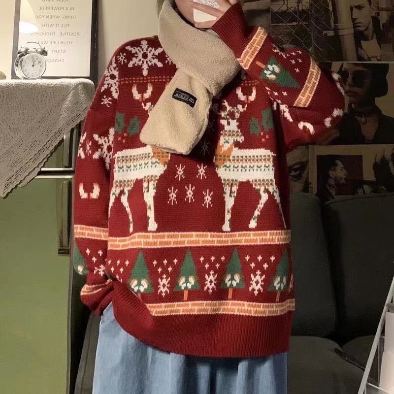 크리스마스 크루넥 스웨터 남자의 가을과 겨울 두꺼운 니트 재킷 느슨한 게으른 홍콩 스타일 빈티지 베이스 셔츠 트렌디스토어 가기
