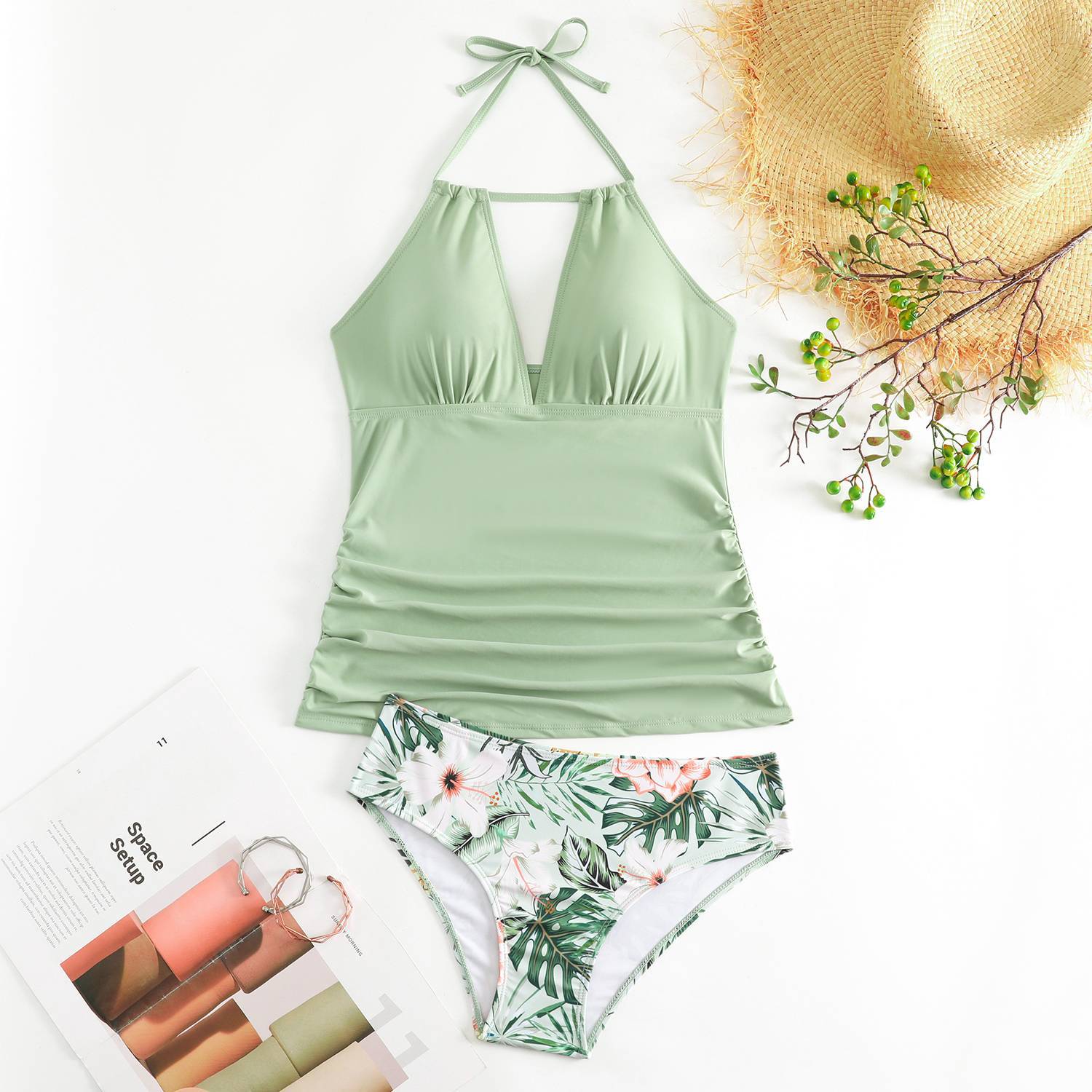2025 유럽 및 미국 신상품 크로스보더 아마존 해외 무역 홀터넥 백리스 프린트 솔리드 컬러 투피스 여성 수영복스토어 가기