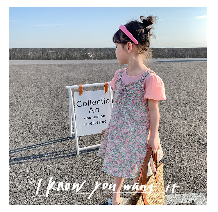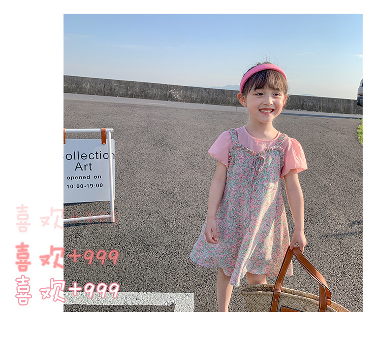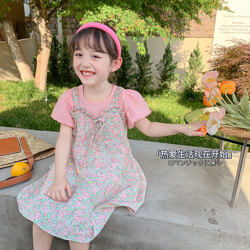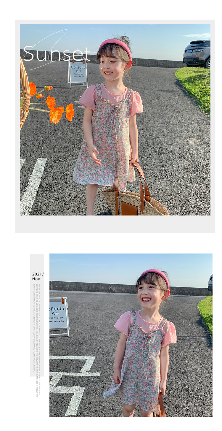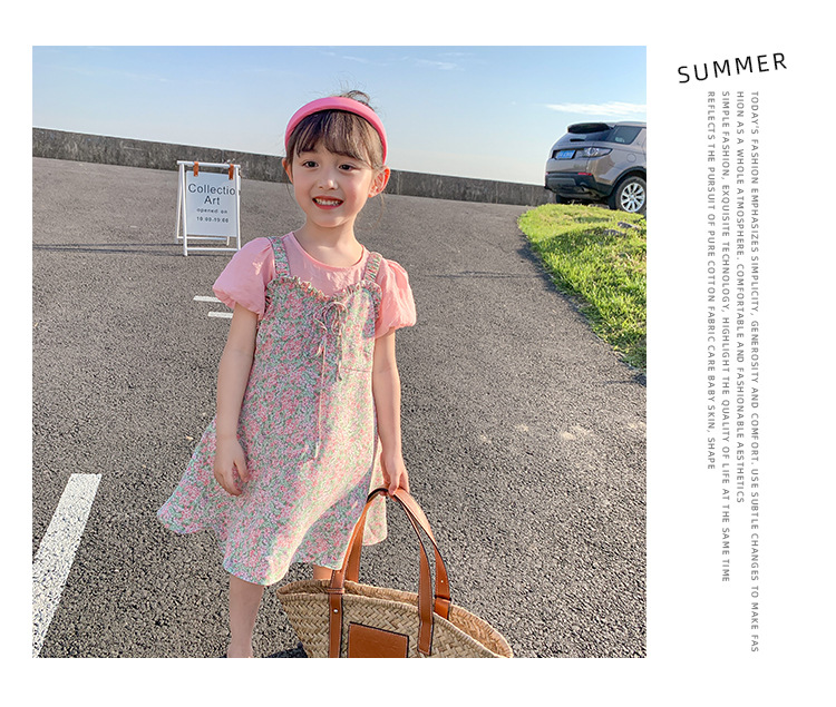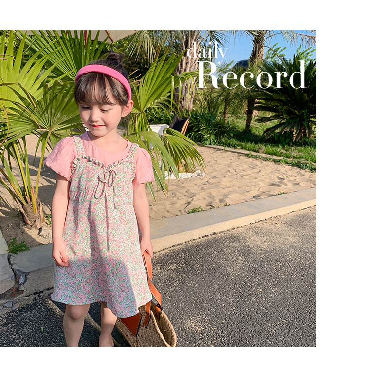 Ancorelala 아동복 여름 신상 여아 꽃무늬 멜빵 원피스와 반팔 상의 투피스 세트