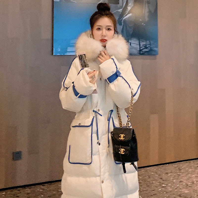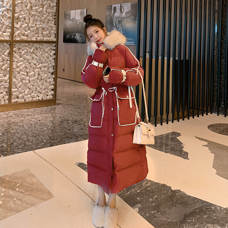 리얼 샷 다운 코튼 패딩 재킷 여성용 중간 길이 대형 모피 칼라 2023 겨울 새로운 후드 허리 우아한 면 패딩 코트스토어 가기