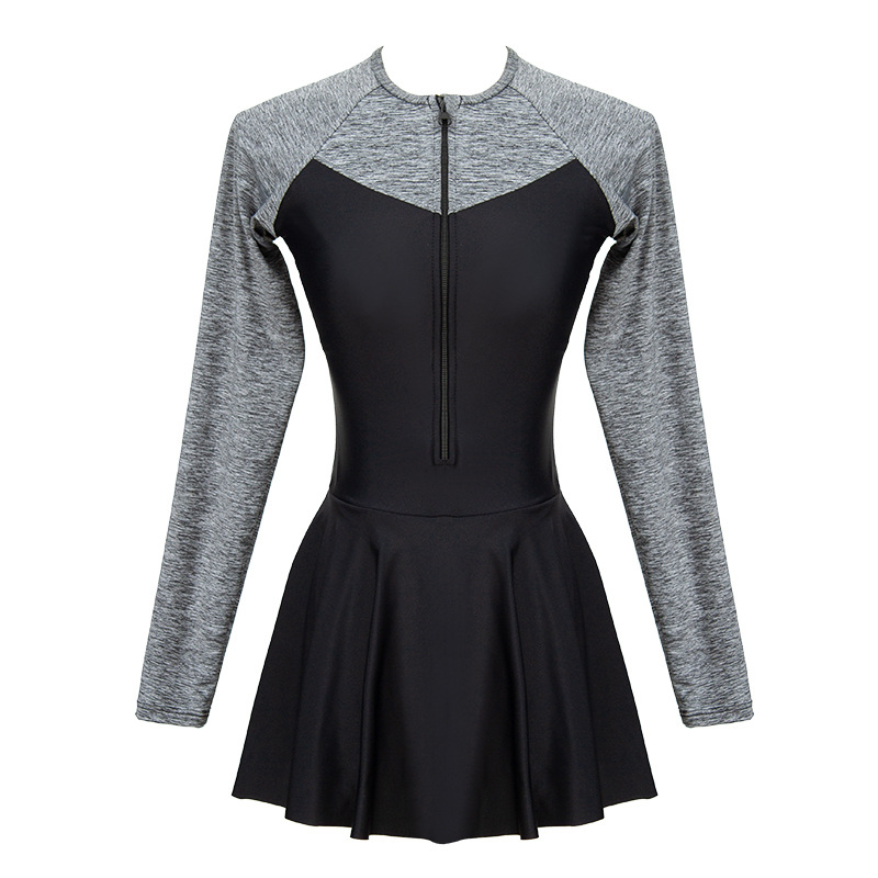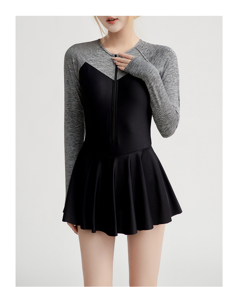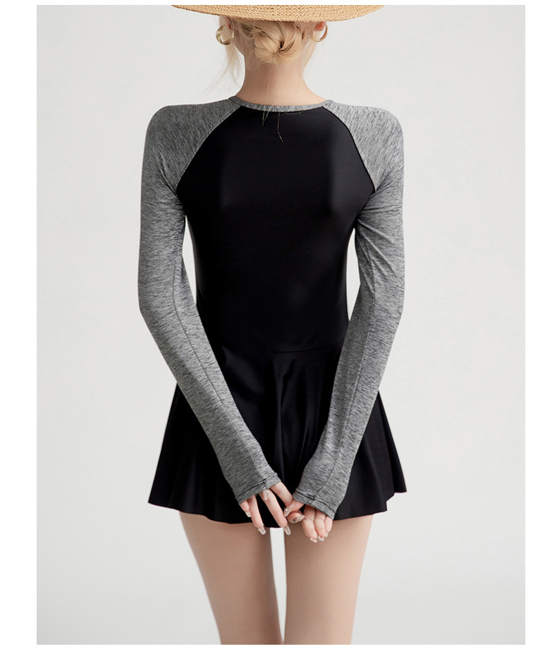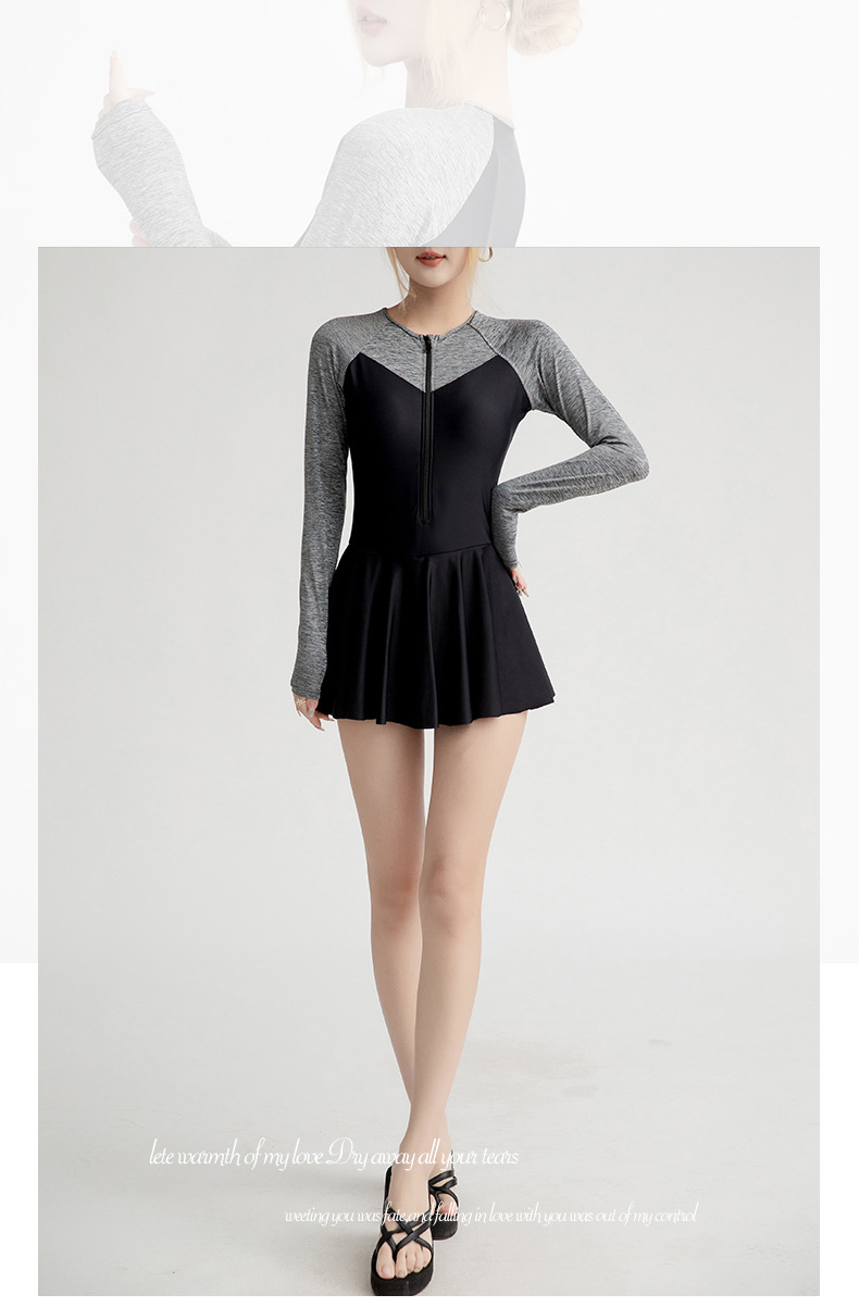 새로운 색상 매칭 스포츠 수영복 여성 학생 배꼽 덮음 슬리밍 보수적 인 플랫 앵글 긴팔 자외선 차단제 스커트 원피스 온천