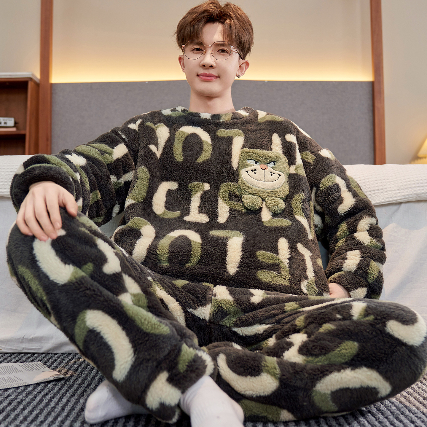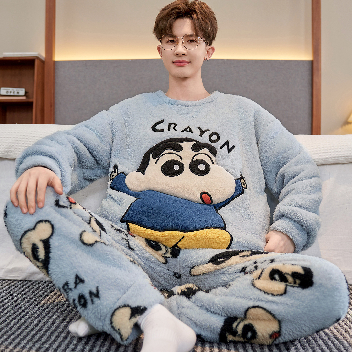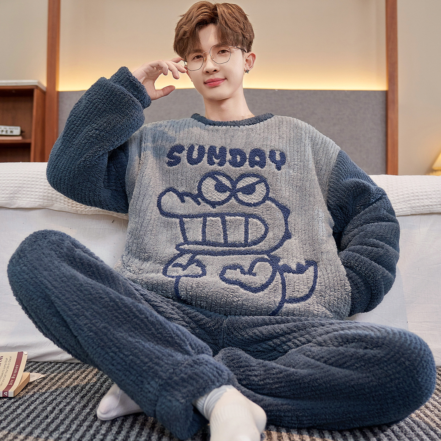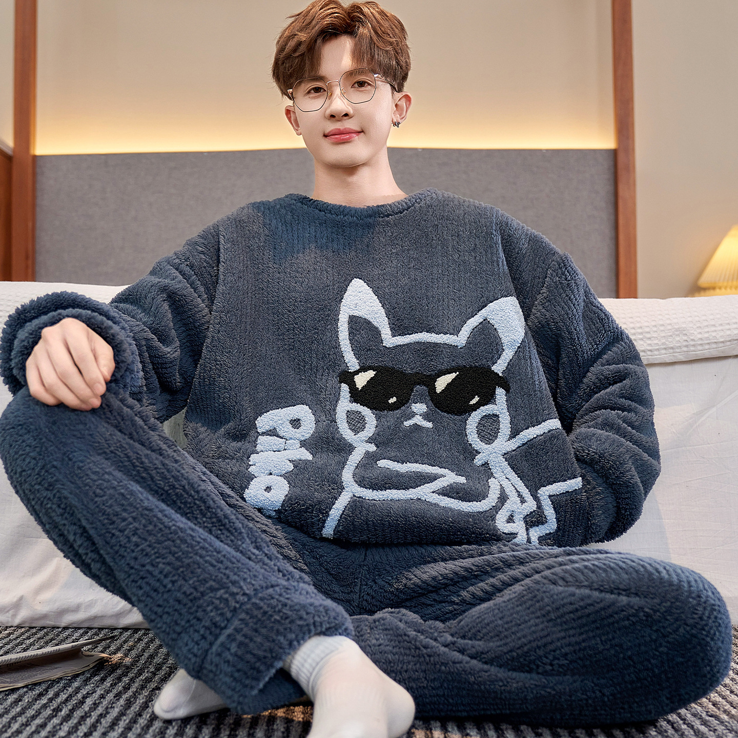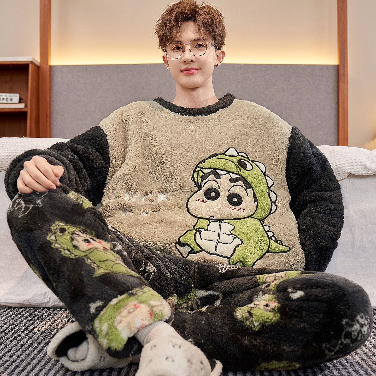 잠옷 남자의 겨울 산호 양털 두꺼운 기모 따뜻한 가정 옷 세트 만화 플란넬 풀오버 남자의 겨울 스타일스토어 가기