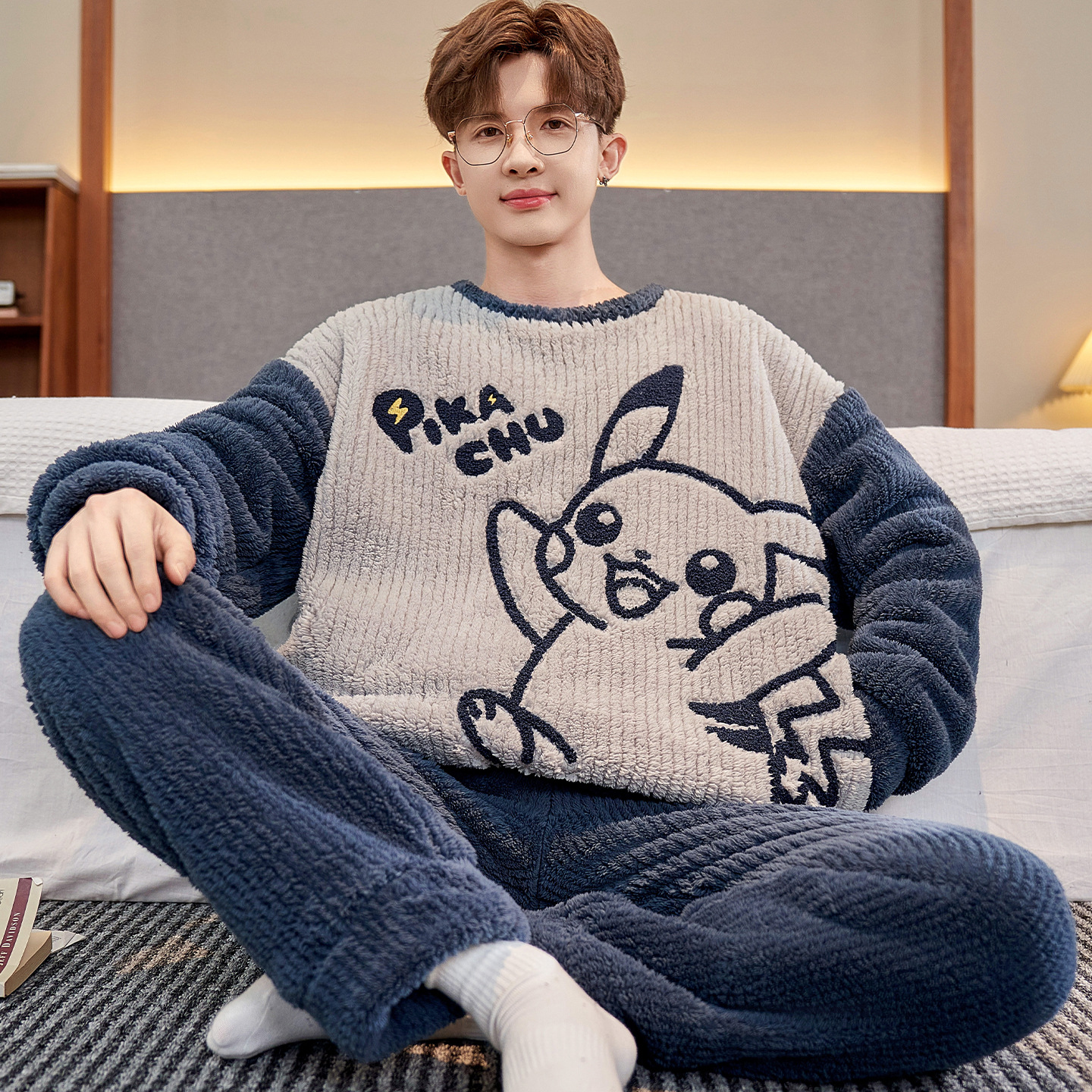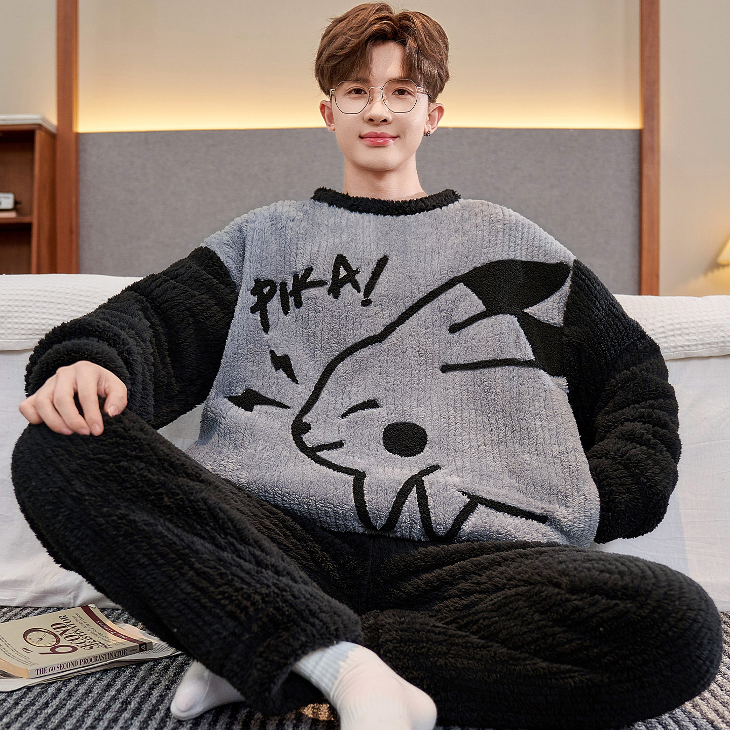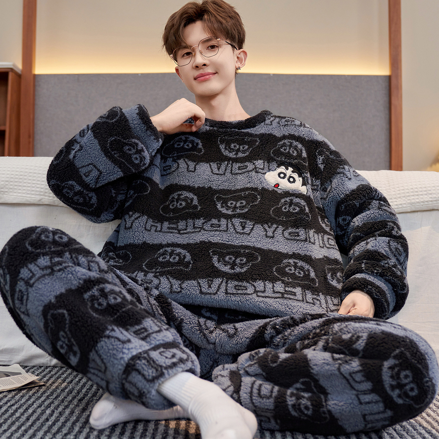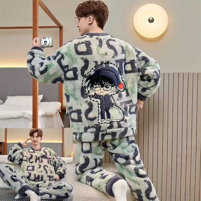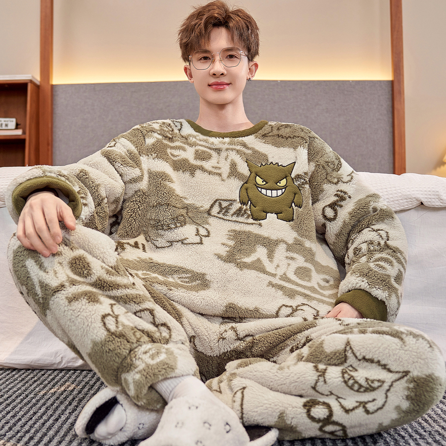 잠옷 남자의 겨울 산호 양털 두꺼운 기모 따뜻한 가정 옷 세트 만화 플란넬 풀오버 남자의 겨울 스타일스토어 가기
