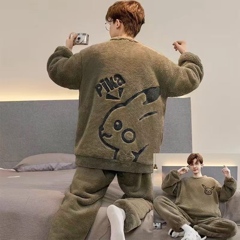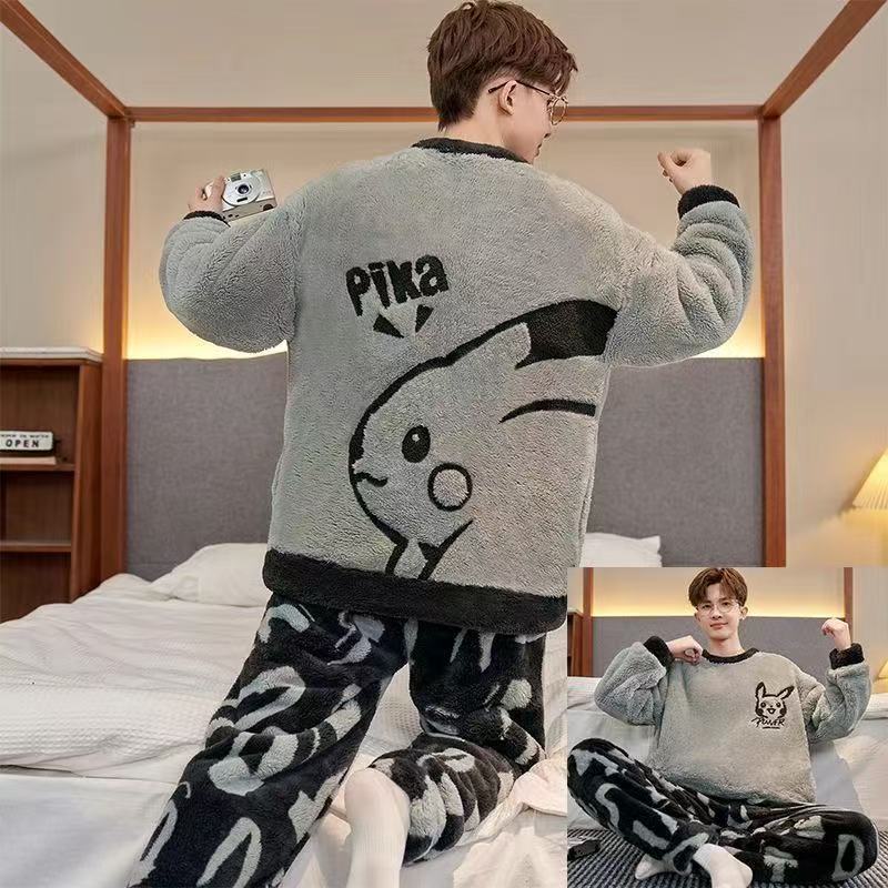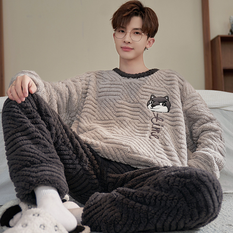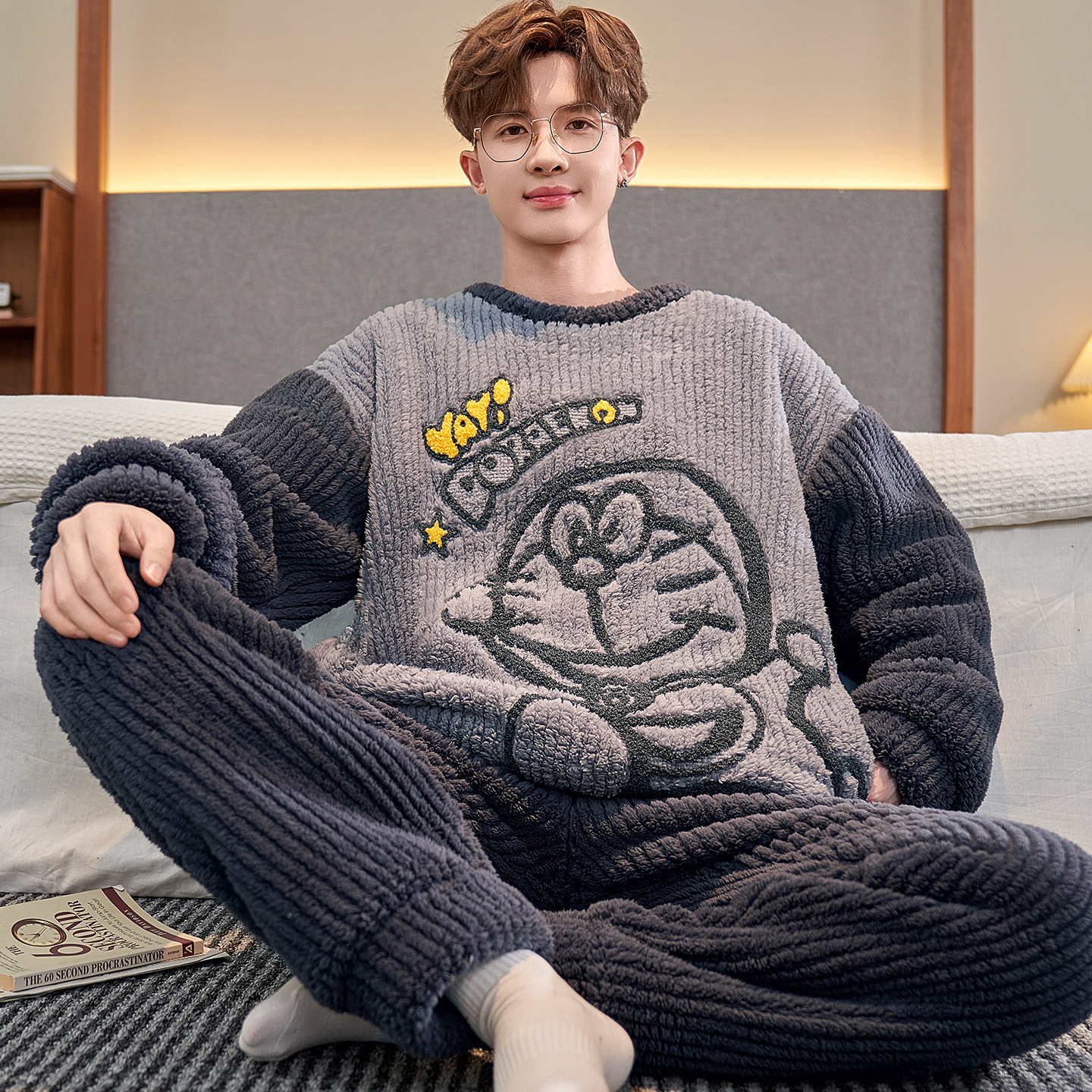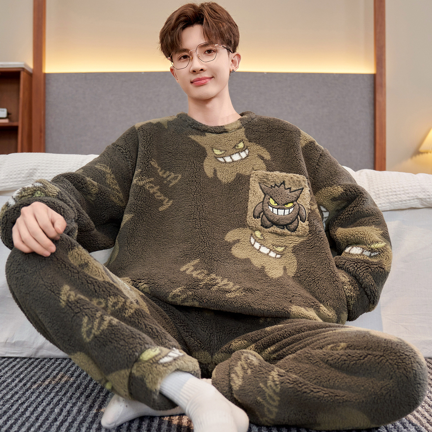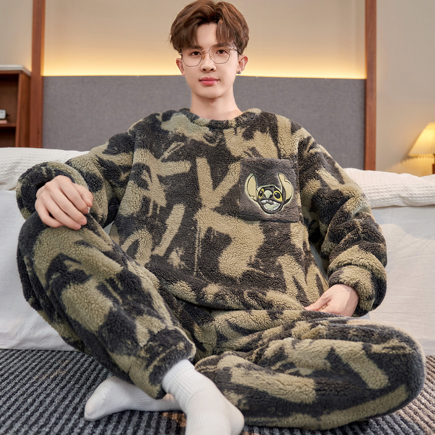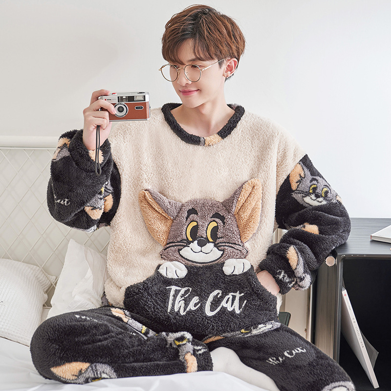 잠옷 남자의 겨울 산호 양털 두꺼운 기모 따뜻한 가정 옷 세트 만화 플란넬 풀오버 남자의 겨울 스타일스토어 가기